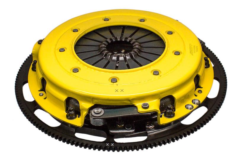 T2R-F02 race, twin disc kit offers twice the number of disc surfaces for better wear, heat capacity and long life compared to single disc kits. These kits use a proprietary Positive Lift Floater System design, which results in quiet operation with no floater rattle and no posts to wear. ACT twin disc kits undergo an exclusive four-stage, heat-treating process on all diaphragms. The ACT twin disc features the ability to adjust for disc wear and provides equal disengagement for discs. ACT's 6-pad rigid race discs are made with high quality, ceramic friction materials. The chrome-moly hub is heat-treated for strength and durability. The lightweight, rigid design allows for quicker shifts and trouble-free service. All ACT twin disc kits include a CNC-machined and dynamically balanced flywheel to ensure trouble-free installation and operation. ACT twin disc kits include a pressure plate, two discs, a floater, flywheel and alignment tool. Some kits may include a pilot bearing and release bearing.