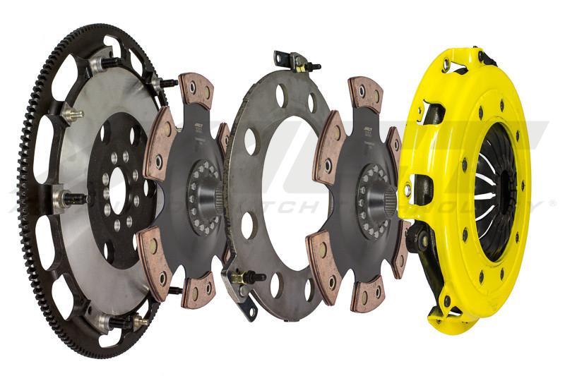 The ACT twin disc features the ability to adjust for disc wear and provides equal disengagement for discs. ACT's 6-pad rigid race discs are made with high quality, ceramic friction materials. The chrome-moly hub is heat-treated for strength and durability. The lightweight, rigid design allows for quicker shifts and trouble-free service. All ACT twin disc kits include a CNC-machined and dynamically balanced flywheel to ensure trouble-free installation and operation. ACT twin disc kits include a pressure plate, two discs, a floater, flywheel and alignment tool. Some kits may include a pilot bearing and release bearing.