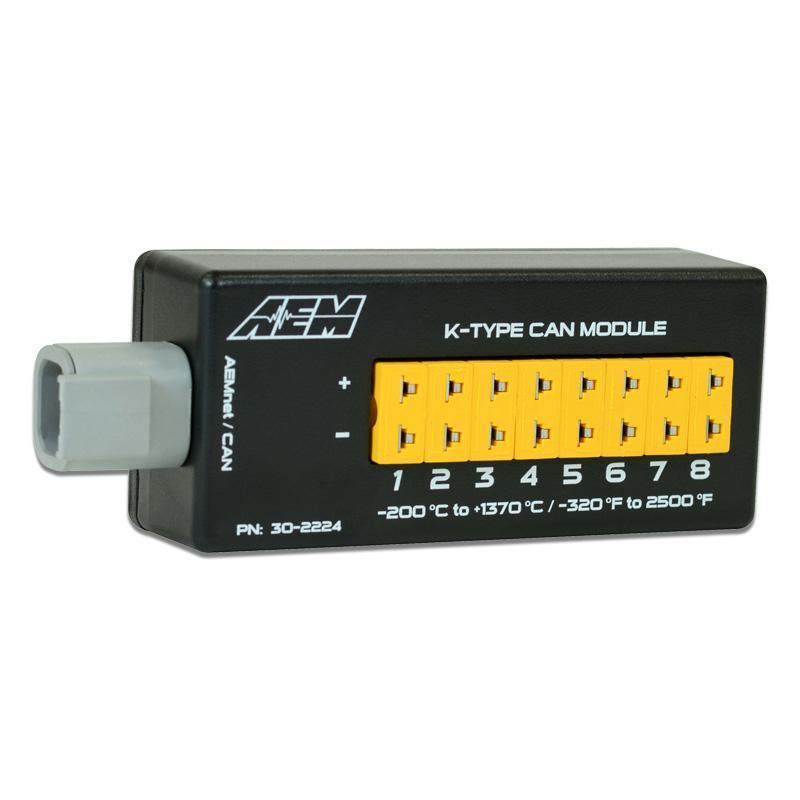 AEM's 8-Channel K-Type Thermocouple EGT CAN Module (PN 30-2224) allows racers and enthusiasts to install eight K-type thermocouple sensors onto their vehicle and transmit all 8 temp channels to a CD Carbon Digital Dash or 3rd Party programmable CAN device via a one-plug CAN bus connection. It connects out of the box to AEM’s CD Digital Dashes and it can be configured to send data to virtually any CAN-based receiving device that has programmable CAN bus capability!
