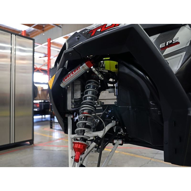 These 2.5" diameter coilovers feature race-winning engineering components that have 20+ years of testing, made into a specifically designed kit that will bolt directly onto your side-by-side. This kit offers adjustable ride height and Sway-A-Way's new Mid-Speed Compression Adjusters for superior off-road damping curves without sacrificing any off-road comfort or handling. These coilovers are 100% designed and built in the USA and feature bright zinc plated steel cylinder bodies and CNC machined aluminum components. The kit comes pre-set for original ride height and damping while also including a spanner wrench to change spring pre-load and spring crossover stop nuts to allow for fine tuning. Whether you are riding dunes, racing, or blasting across the desert, these coilovers allow you to find your ideal setup for the given conditions. This package is designed as a direct fit application and requires no modifications to the vehicle. Sway-A-Way's new 2.5 Series Mid-Speed Compression Adjusters mount directly into the remote reservoir. Offering 16 clicks of resolution, the compression adjuster can go from the unrestricted, fully open (soft) position, to the fully closed (hard) position - offering up to a 200% increase in damping force, in just two full turns of the GF polymer adjuster knob. Rebound damping will remain unaffected regardless of the setting and valving combination chosen. Constructed from billet 6061-T6 aluminum, the red anodized and laser etched housing is built to withstand the harshest of environments with excellent corrosion resistance. The metering piston is CNC machined from 7075-T6 aluminum to provide the best service life for high speed applications. Sway-A-Way's mid-speed compression adjusters are an excellent solution for any application that varies weight often, or that might be used in a variety of terrains where a quick adjustment is desired for optimizing the comfort level of your ride.