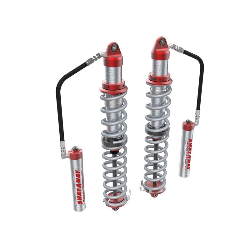 These 3.0" diameter coilovers feature race-winning engineering components that have 20+ years of testing, made into a specifically designed kit that will bolt directly onto your side-by-side. This kit offers adjustable ride height and Sway-A-Way's new Mid-Speed Compression Adjusters for superior off-road damping curves without sacrificing any off-road comfort or handling. These coilovers are 100% designed and built in the USA and feature bright zinc plated steel cylinder bodies and CNC machined aluminum components. The kit comes pre-set for original ride height and damping while also including a spanner wrench to change spring pre-load and spring crossover stop nuts to allow for fine tuning. Whether you are riding dunes, racing, or blasting across the desert, these coilovers allow you to find your ideal setup for the given conditions. This package is designed as a direct fit application and requires no modifications to the vehicle. Sway-A-Way's new 2.5 Series Mid-Speed Compression Adjusters mount directly into the remote reservoir. Offering 16 clicks of resolution, the compression adjuster can go from the unrestricted, fully open (soft) position, to the fully closed (hard) position - offering up to a 200% increase in damping force, in just two full turns of the GF polymer adjuster knob. Rebound damping will remain unaffected regardless of the setting and valving combination chosen. Constructed from billet 6061-T6 aluminum, the red anodized and laser etched housing is built to withstand the harshest of environments with excellent corrosion resistance. The metering piston is CNC machined from 7075-T6 aluminum to provide the best service life for high speed applications. Sway-A-Way's mid-speed compression adjusters are an excellent solution for any application that varies weight often, or that might be used in a variety of terrains where a quick adjustment is desired for optimizing the comfort level of your ride.