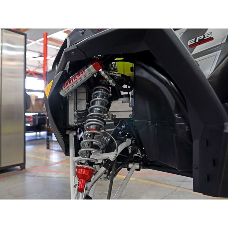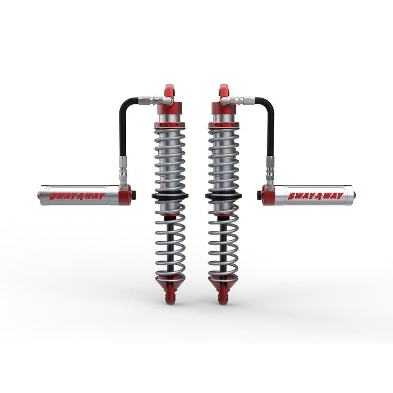 These 2.5" diameter coilovers feature race-winning engineering components that have 20+ years of testing, made into a specifically designed kit that will bolt directly onto your side-by-side. This kit offers adjustable ride height and Sway-A-Way's new Mid-Speed Compression Adjusters for superior off-road damping curves without sacrificing any off-road comfort or handling. These coilovers are 100% designed and built in the USA and feature bright zinc plated steel cylinder bodies and CNC machined aluminum components. The kit comes pre-set for original ride height and damping while also including a spanner wrench to change spring pre-load and spring crossover stop nuts to allow for fine tuning. Whether you are riding dunes, racing, or blasting across the desert, these coilovers allow you to find your ideal setup for the given conditions. This package is designed as a direct fit application and requires no modifications to the vehicle. Sway-A-Way's new 2.5 Series Mid-Speed Compression Adjusters mount directly into the remote reservoir. Offering 16 clicks of resolution, the compression adjuster can go from the unrestricted, fully open (soft) position, to the fully closed (hard) position - offering up to a 200% increase in damping force, in just two full turns of the GF polymer adjuster knob. Rebound damping will remain unaffected regardless of the setting and valving combination chosen. Constructed from billet 6061-T6 aluminum, the red anodized and laser etched housing is built to withstand the harshest of environments with excellent corrosion resistance. The metering piston is CNC machined from 7075-T6 aluminum to provide the best service life for high speed applications. Sway-A-Way's mid-speed compression adjusters are an excellent solution for any application that varies weight often, or that might be used in a variety of terrains where a quick adjustment is desired for optimizing the comfort level of your ride.
