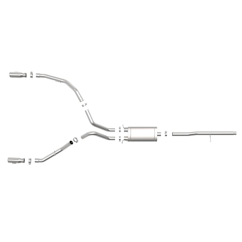 aFe POWER is proud to introduce the Apollo GT Series dual rear exit cat-back exhaust system for the 2014-2019 GM Silverado/Sierra 1500 with V6-4.3L/V8-5.3L engines. This cat-back exhaust system is constructed out of 3" 100% MIG-welded, mandrel-bent, stainless steel tubing for maximum flow. The smooth transition bends allow for low turbulence, increasing horsepower, torque and improving throttle response. In testing, this system resulted in gains up to +14 horsepower and +17 lbs. x ft. of torque verified by our in house dyno (vehicle tested with 5.3L engine). A hi-flow 21" single-in dual out muffler is included which improves performance while maintaining an awesome sound. This unit uses all factory mounting locations and comes with a bolt-on bracket that supports the driver side tailpipe. The aFe POWER rear exit exhaust system was designed to retain the spare tire and includes high quality band clamps and OE-style bayonet hangers. This makes for an easy installation with no cutting required. To finish off the exhaust, dual 4-1/2" polished stainless steel tips with a laser-cut stainless steel aFe POWER badges for an aggressive style. This kit retains your spare tire and includes high quality band clamps and OE-style bayonet hangers for a hassle-free installation.