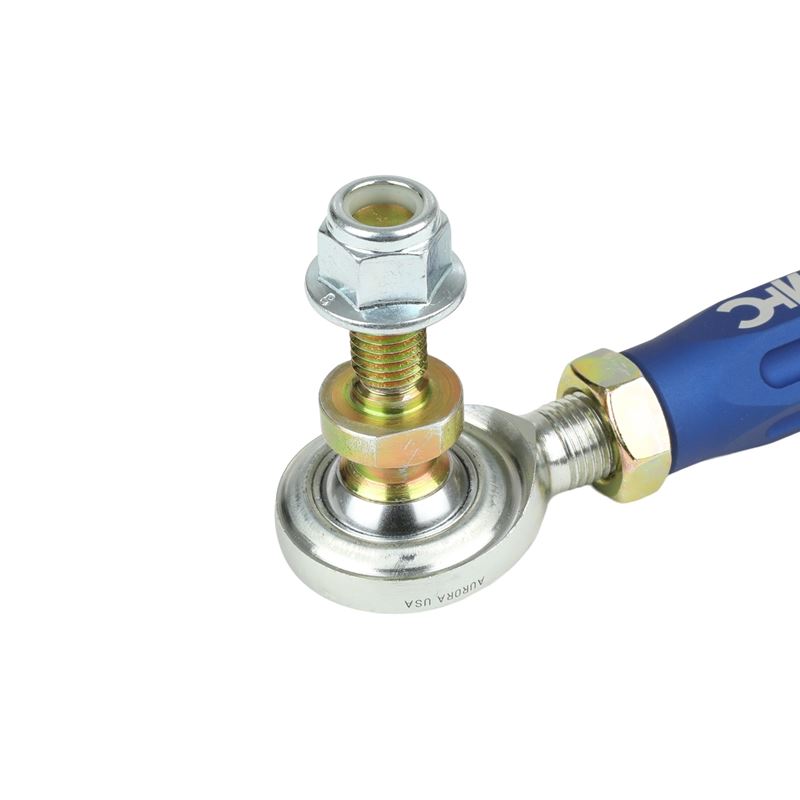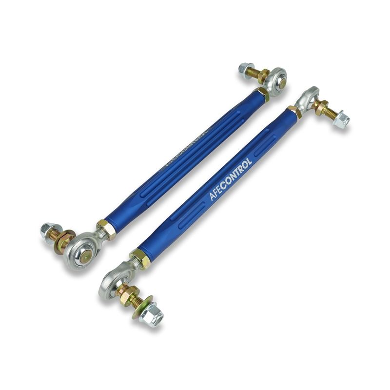 Improve handling and eliminate sway bar preload with aFe CONTROL adjustable end links. Sway bar preload is a scenario where your sway bar is in tension when your car is at rest. Sway bar preload affect's how the vehicle handles making it stiffer when turning one direction versus the other. Factors like lowering springs can end up with uneven suspension heights which can lead to sway bar preload. If you have adjustable coilovers and are corner balancing the vehicle, it is especially important to zero out your sway bar preload to get consistent handling. Made with high quality Aurora rod ends and precision machined adjusters, these end links will make short work of dialing in your suspension. Joint articulation was designed to exceed factory range which prevents binding during operation. Equipped with right-hand and left-hand rod ends, the end links can be adjusted on-car without removal. Whether you're setting your car up for the street or track, aFe CONTROL will get you there! Our adjusters are CNC machined out of 6061-T6 aluminum and anodized blue with laser etched logo. For superior quality and reliability, we use PTFE lined Aurora rod ends.