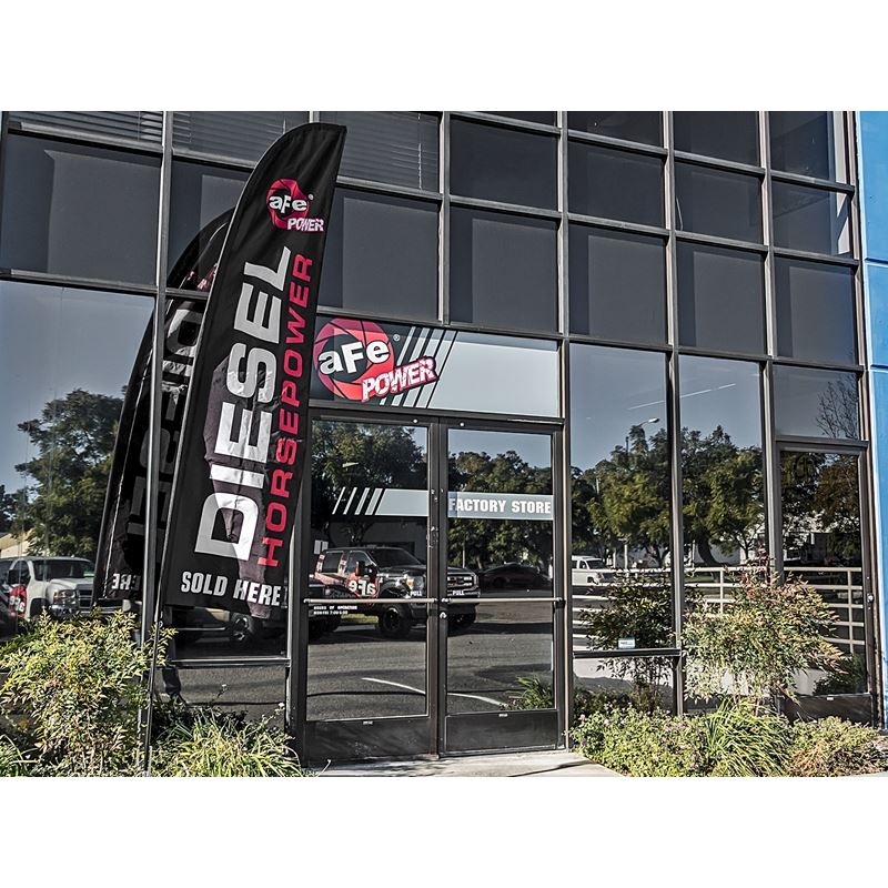 Show your aFe Power support with one of our NEW 12 ft. yard banner. This stylish banner is a perfect addition to the front ofany Diesel Accessory Shop. This custom 12ft x 2.5ft banner lets everyone know where to go for their aFe performance products. This banner comes in a nice black canvas bag for protection during transportation, and includes all necessary hardware to install.