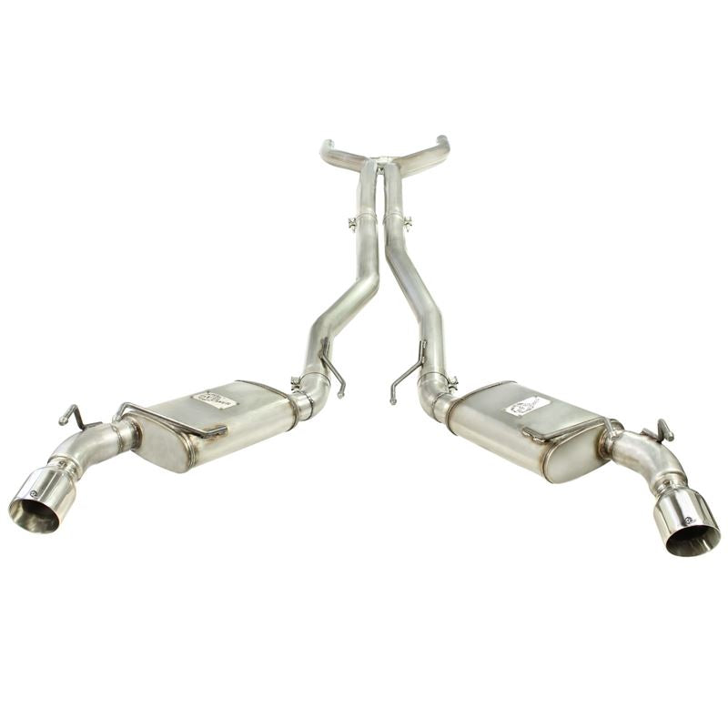 Mach Force XP 409 SS Cat-Back Exhaust System with Split Rear Exit (49-44039-P) by aFe. True muscle car sound. With Equalizer Balance Tube. Exhaust System Type: Cat-Back. Exhaust Tubing Material: 409 SS. Main Tubing Diameter: 3". Exhaust System Sound: Aggressive / Loud. Get increased exhaust flow, more horsepower and torque, improved performance and lower exhaust gas temperatures with the aFe Mach Force XP Cat-Back Exhaust System. aFe dyno tests every system for maximum gains, and constructs them from mandrel-bent stainless steel for maximum flow and long-lasting durability. This system begins at the Cat (Catalytic Converter).