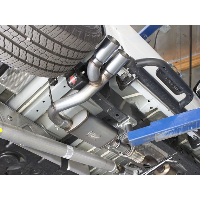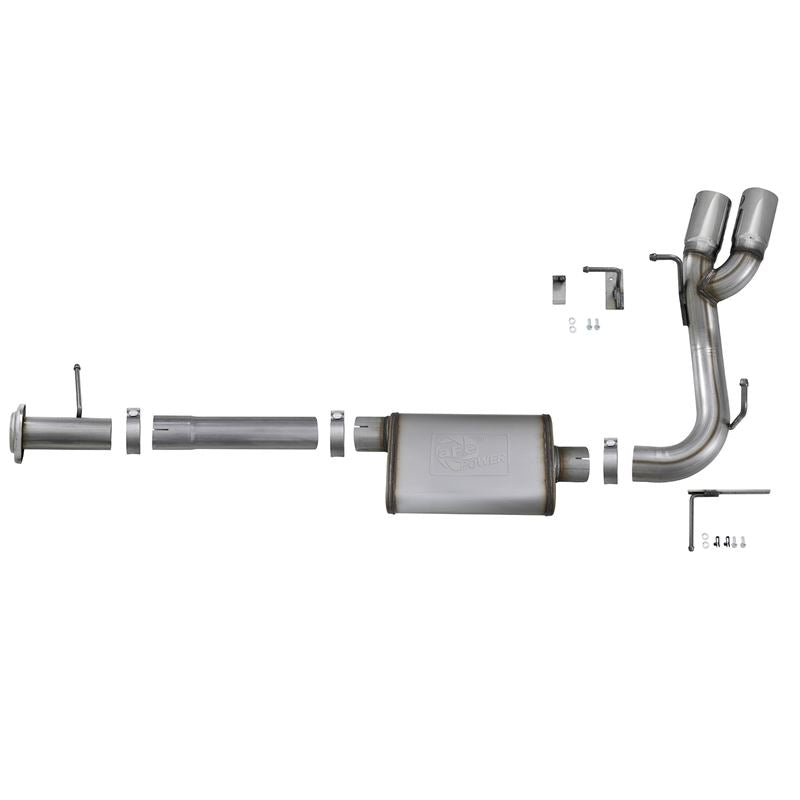 Rebel Series 409 SS Cat-Back Exhaust System with Dual Side Exit (49-44096-P) by aFe. Exhaust System Type: Cat-Back. Exhaust Tubing Material: 409 SS. Main Tubing Diameter: 3". Exhaust System Sound: Aggressive / Loud. aFe power introduces an all new Rebel Series exhaust system. This Rebel Series cat-back is designed with dual intercooled exhaust tips that exit in front of the rear passenger tire for a unique, aggressive look.