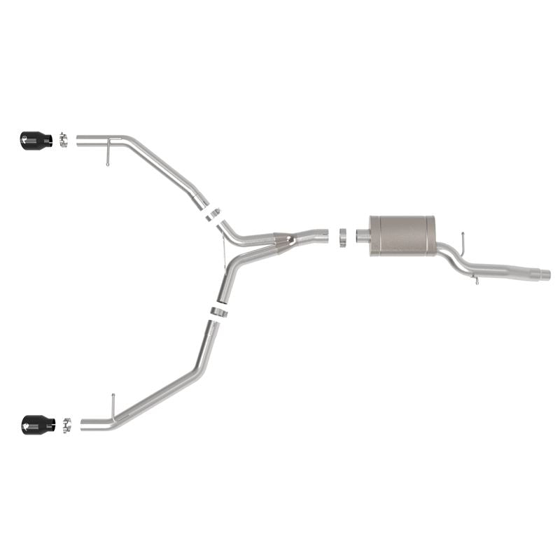 This axle-back exhaust system is constructed of 3 IN to 2-1/2 IN mandrel-bent 304 stainless steel tubing for maximum strength and durability. This system features a high-flow 304 stainless steel polished muffler, producing a mild sound. The muffler has a polished finish for ultimate corrosion resistance. Finishing off this exhaust system are dual 4 IN diameter black 304 stainless steel clamp-on exhaust tips. The tips features a laser etched aFe POWER logo for a unique style. This system produces a mild sound unleashing all available horsepower and torque. Utilizing factory style hangers this system is a direct bolt-on system, which requires no cutting or modifications for a hassle-free installation. Utilizing state-of-the-art computer-aided design technology, this exhaust system is designed for custom, high tolerance factory fitment. 100% MIG-Welded for race-proven strength and durability.
