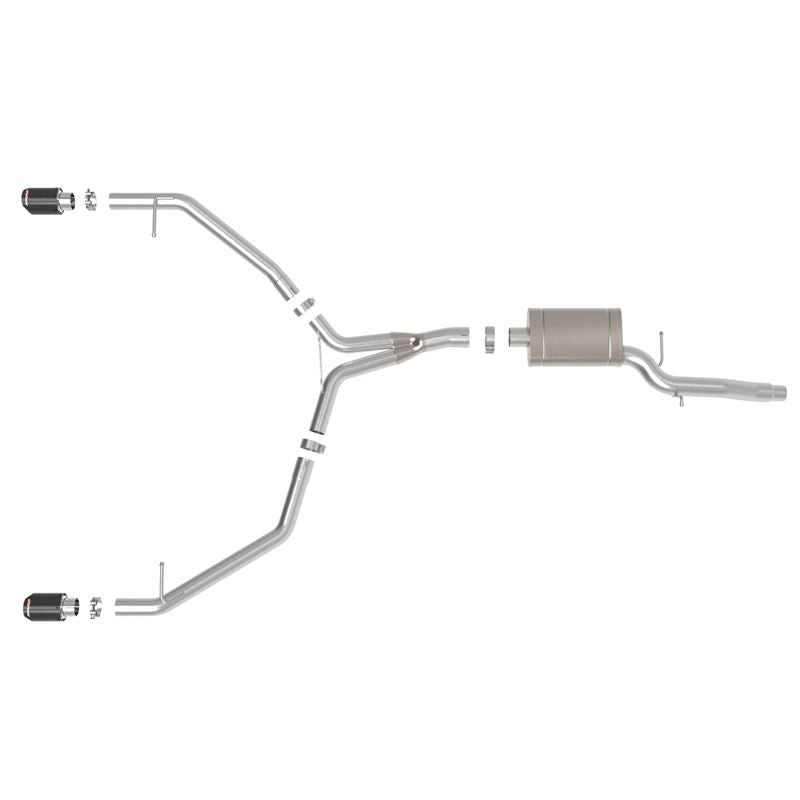 This axle-back exhaust system is constructed of 3 IN to 2-1/2 IN mandrel-bent 304 stainless steel tubing for maximum strength and durability. This system features a high-flow 304 stainless steel polished muffler, producing a mild sound. The muffler has a polished finish for ultimate corrosion resistance. Finishing off this exhaust system are dual 4 IN diameter carbon fiber 304 stainless steel clamp-on exhaust tips. The tips features an aFe POWER logo for a unique style. This system produces a mild sound unleashing all available horsepower and torque. Utilizing factory style hangers this system is a direct bolt-on system, which requires no cutting or modifications for a hassle-free installation. Utilizing state-of-the-art computer-aided design technology, this exhaust system is designed for custom, high tolerance factory fitment. 100% MIG-Welded for race-proven strength and durability.