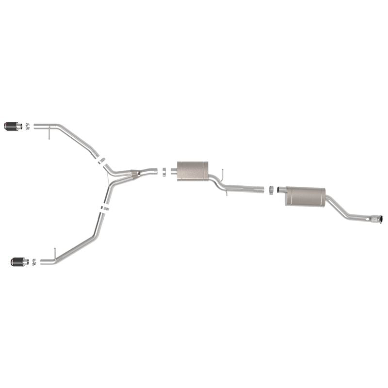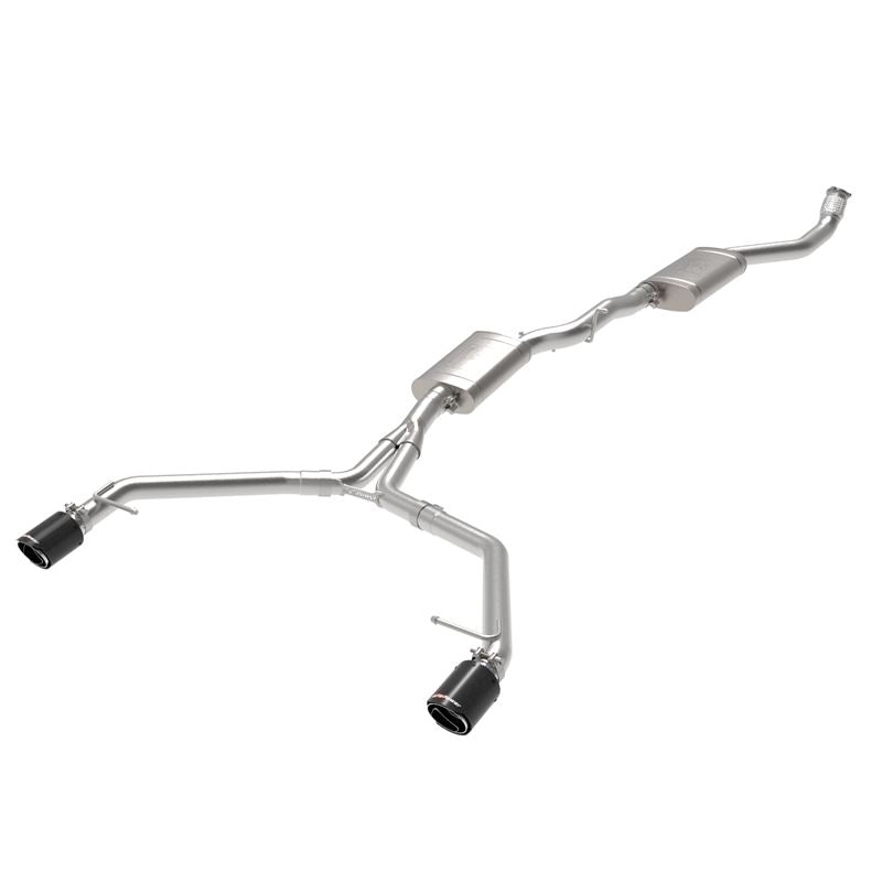 This cat-back exhaust system is constructed of 3 IN to 2-1/2 IN mandrel-bent 304 stainless steel tubing for maximum strength and durability. This system features high-flow stainless steel mufflers, producing a mild sound. Finishing off this exhaust system are dual 4 IN diameter carbon fiber 304 stainless steel clamp-on exhaust tips. The tips features an aFe POWER logo for a unique style. This system produces a mild sound unleashing all available horsepower and torque. Utilizing a factory style flange and hangers this system is a direct bolt-on system, which requires no cutting or modifications for a hassle-free installation. This cat-back exhaust system uses a heavy duty flex pipe with an internal interlock liner for added strength and durability. Utilizing state-of-the-art computer-aided design technology, this exhaust system is designed for custom, high tolerance factory fitment. 100% MIG-Welded for race-proven strength and durability.