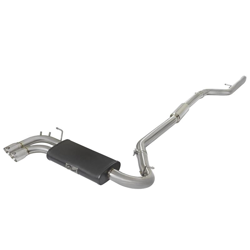 Mach Force XP 304 SS Cat-Back Exhaust System with Dual Side Exit (49-36329-P) by aFe. Max gain of +6 horsepower and +8 ft. lbs. of torque. With Polished 304 SS Resonator. Exhaust System Type: Cat-Back. Exhaust Tubing Material: 304 SS. Main Tubing Diameter: 3" to 2.25". Exhaust System Sound: Aggressive / Loud. Get increased exhaust flow, more horsepower and torque, improved performance and lower exhaust gas temperatures with the aFe Mach Force XP Cat-Back Exhaust System. aFe dyno tests every system for maximum gains, and constructs them from mandrel-bent stainless steel for maximum flow and long-lasting durability. This system begins at the Cat (Catalytic Converter).