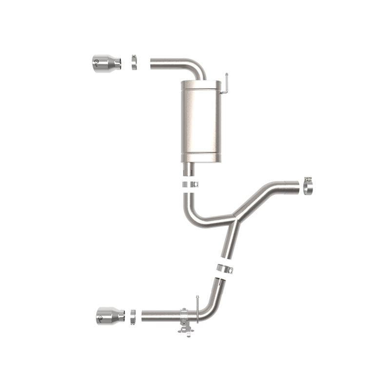 This axle-back exhaust system is constructed of 3 IN - 2-1/2 IN mandrel-bent 304 stainless steel tubing for maximum strength and durability. This system features a high-flow 304 stainless steel polished muffler, producing a mild sound. The muffler has a polished finish for ultimate corrosion resistance. Finishing off this exhaust system are dual 4 IN diameter polished 304 stainless steel clamp-on exhaust tips. The tips features a laser etched aFe POWER logo for a unique style. This system produces a mild sound unleashing all available horsepower and torque. Some cutting may be required, see instruction sheet for further information. Utilizing factory style hangers this system mounts directly to factory mounting locations for a hassle-free installation. This system incorporates a factory style exhaust valve which use the factory exhaust valve motor (not included). The valve helps regulate, direct and control the flow of exhaust gases by opening, closing, or partially obstructing passageways depending on throttle position for maximum performance. A mitered merge collector is used to decrease turbulence and increase exhaust velocity resulting in increased horsepower, torque and improved throttle response. Utilizing state-of-the-art computer-aided design technology, this exhaust system is designed for custom, high tolerance factory fitment. 100% MIG-Welded for race-proven strength and durability.