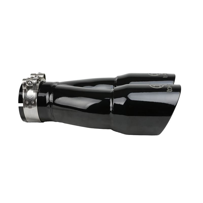 Universal Clamp-On Tip:Designed to fit 2-1/2" exhaust systems; 2-1/2" inlet x 3" dual outlet and 9-1/2" inch length.