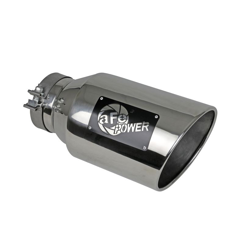 This direct-fit clamp-on tip is constructed from 304 stainless steel and features a polished finish for corrosion resistance for long lasting good looks. Designed to fit 5" exhaust systems; 5" inlet x 8" outlet and 15" inch length. This tip features an aFe POWER logo for an aggressive, custom look. A high quality stainless steel clamp is used for a complete 360 degree sealing surface. This product does not require a CARB EO#.
