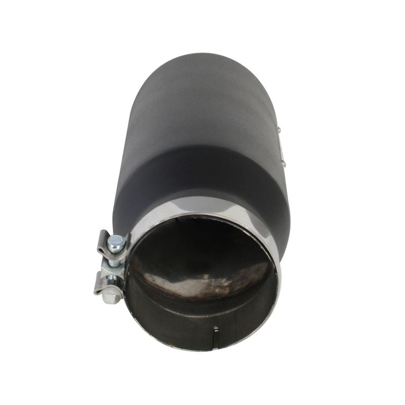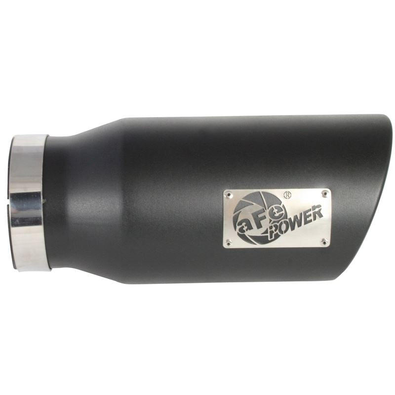 Universal Mach Force XP 409 SS Round Angle Cut Black Exhaust Tip with Laser Cut Logo (49T50701-B15) by aFe. Tip Shape: Round. Tip Cut Type: Angle Cut. Tip Inlet Diameter: 5". Tip Outlet Diameter: 7". Tip Length: 15". Tip Attachment Style: Bolt-On. This stylish universal exhaust tip will be the finishing touch for any exhaust system. Made of the finest stainless steel, it's available in a highly polished finish or powder coated wrinkle black. Each features the aFe Power logo riveted to the side.