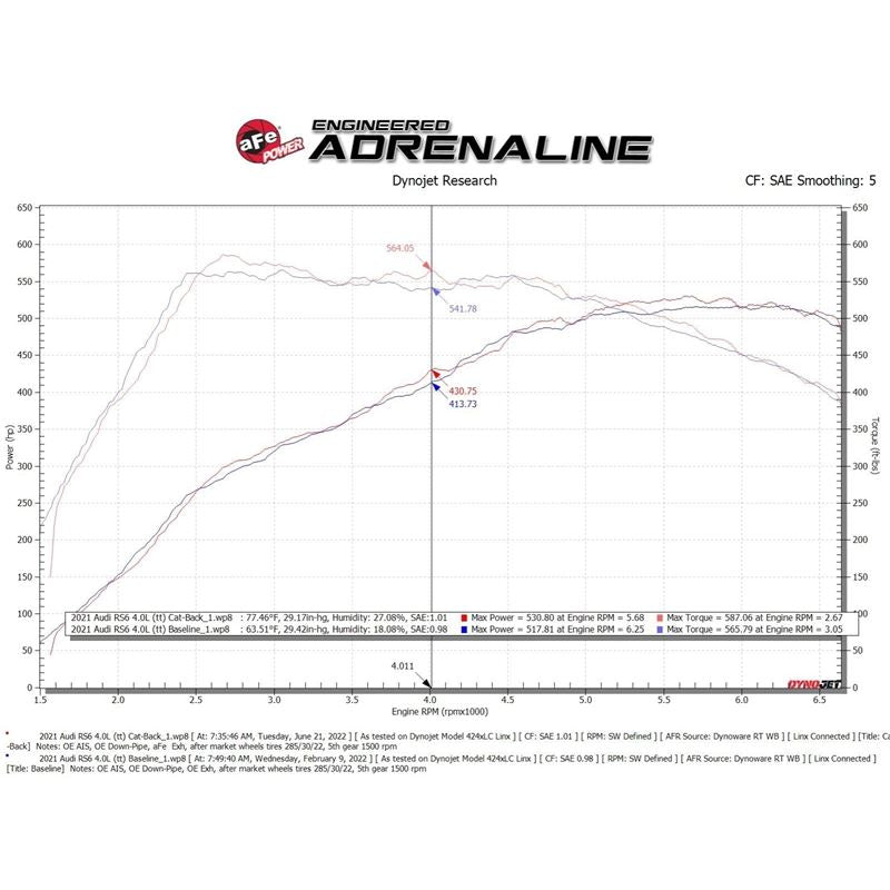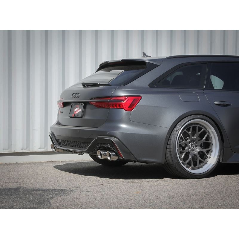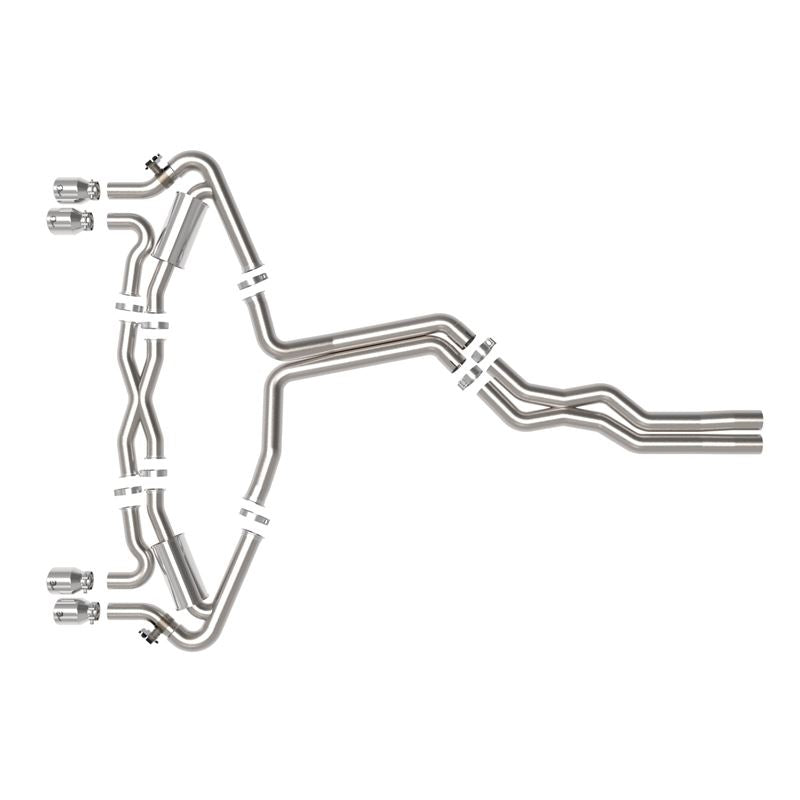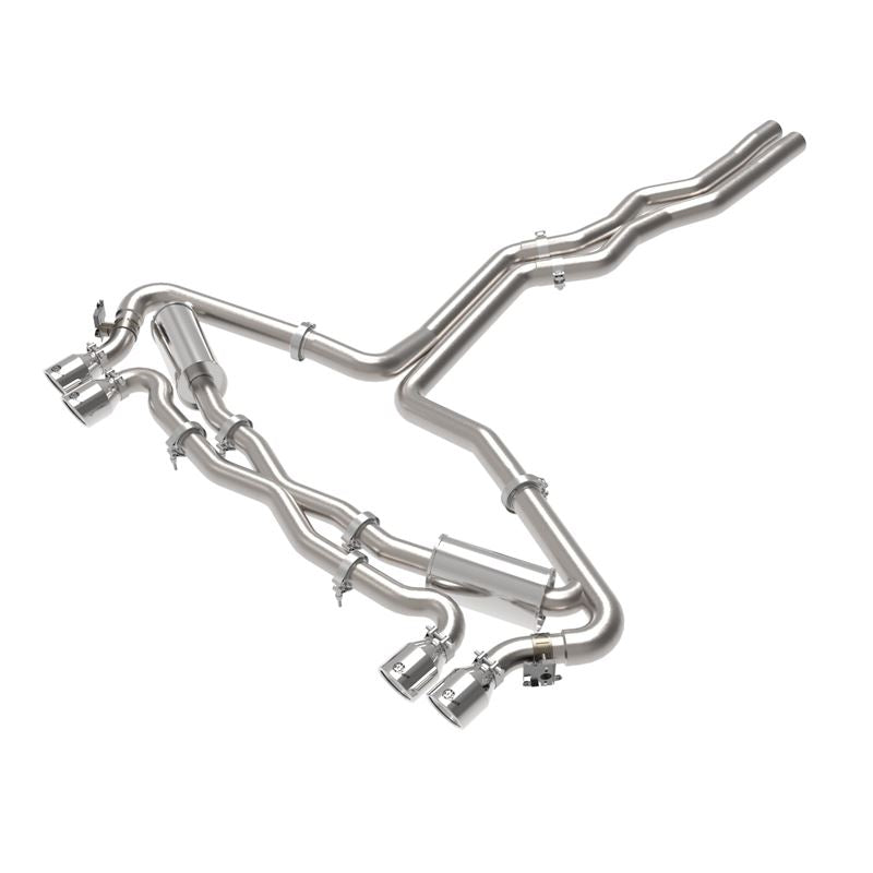 This cat-back exhaust system is constructed of 3 IN - 2-1/2 IN mandrel-bent brushed finished 304 stainless steel tubing for maximum strength and durability. This system features high-flow 304 stainless steel mufflers, producing a deep sound. Finishing off this exhaust system are quad 3-1/2 IN diameter polished 304 stainless steel clamp-on exhaust tips. The tips features a laser etched aFe POWER logo for a unique style. This system produces a deep sound unleashing all available horsepower and torque. Utilizing a factory style flange and hangers this system is a direct bolt-on system, which requires no cutting or modifications for a hassle-free installation. This cat-back exhaust system uses a heavy duty flex pipe with an internal interlock liner for added strength and durability. A mitered merge x-pipe is used to balance and evenly distribute exhaust pulses traveling through the exhaust system, minimizing exhaust drone and maximizing scavenging. This system incorporates factory style exhaust valves which use the factory exhaust valve motors (not included). The valves help regulate, direct and control the flow of exhaust gases by opening, closing, or partially obstructing passageways depending on throttle position for maximum performance. State-of-the-art computer-aided design technology is utilized for precise vehicle fitment. 100% TIG-Welded for race-proven strength and durability.