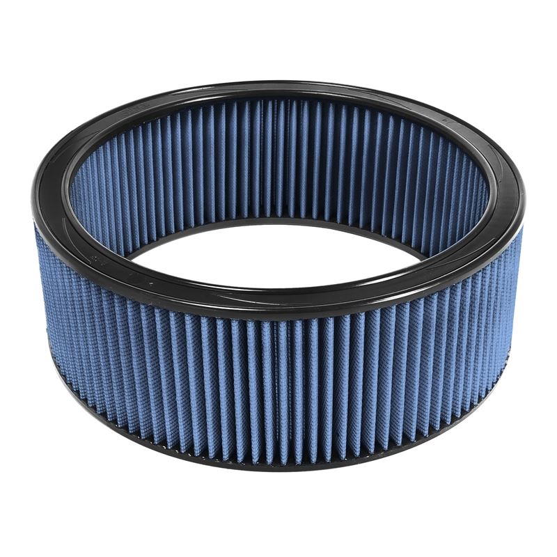 Magnum Flow Pro 5R Round Blue Air Filter (10-10011) by aFe. Constructed with 100% polyurethane on top and bottom, this high flow, oiled OE replacement performance filter will outflow stock paper filter for improved horsepower and torque. Five layers of progressively finer mesh cotton gauze media provide maximum airflow for best performance results. Washable and reusable for multiple cleaning cycles, the tall open evenly spaced pleats provide excellent dust holding capacity for longer service cycle between cleanings. Integrated urethane bump seal insures tight, no leak seal over the life of the filter.