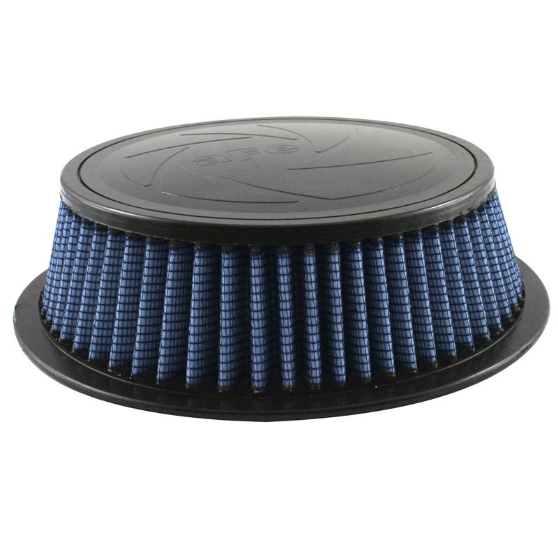 Magnum Flow Pro 5R Round Tapered Blue Air Filter (10-10019) by aFe. Constructed with 100% polyurethane on top and bottom, this high flow, oiled OE replacement performance filter will outflow stock paper filter for improved horsepower and torque. Five layers of progressively finer mesh cotton gauze media provide maximum airflow for best performance results. Washable and reusable for multiple cleaning cycles, the tall open evenly spaced pleats provide excellent dust holding capacity for longer service cycle between cleanings. Integrated urethane bump seal insures tight, no leak seal over the life of the filter.