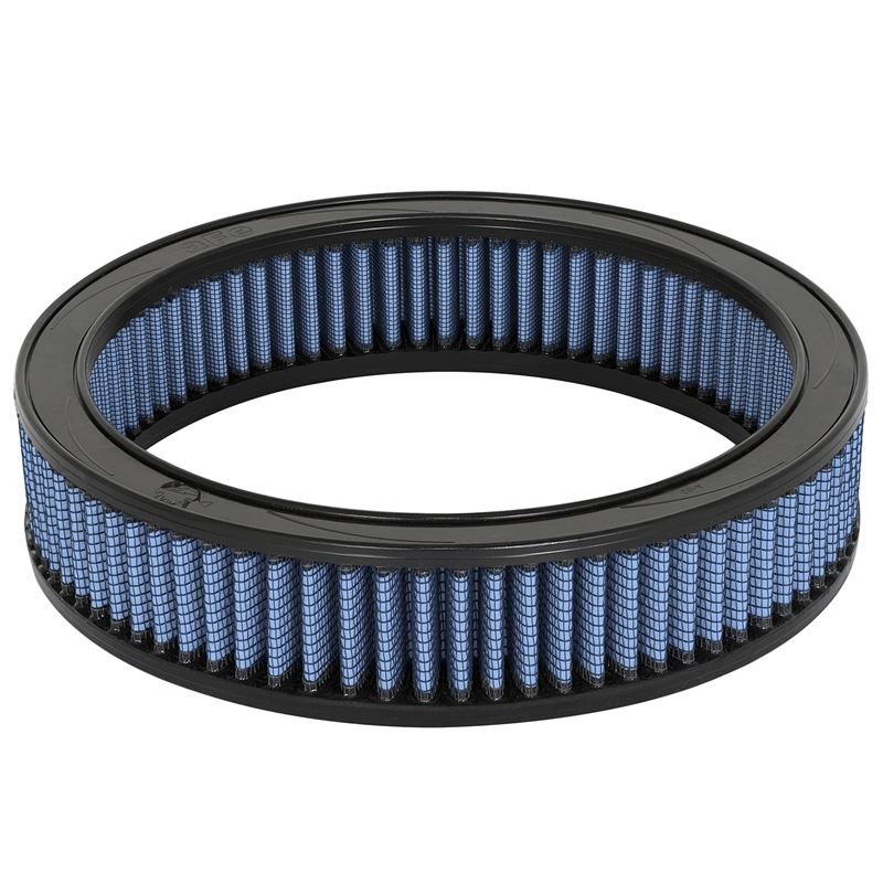 Magnum Flow Pro 5R Round Blue Air Filter (10-10033) by aFe. Constructed with 100% polyurethane on top and bottom, this high flow, oiled OE replacement performance filter will outflow stock paper filter for improved horsepower and torque. Five layers of progressively finer mesh cotton gauze media provide maximum airflow for best performance results. Washable and reusable for multiple cleaning cycles, the tall open evenly spaced pleats provide excellent dust holding capacity for longer service cycle between cleanings. Integrated urethane bump seal insures tight, no leak seal over the life of the filter.
