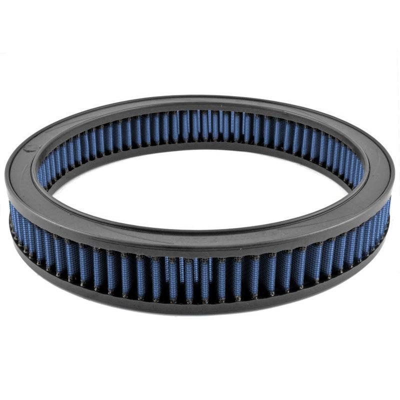 Magnum Flow Pro 5R Round Blue Air Filter (10-10072) by aFe. Constructed with 100% polyurethane on top and bottom, this high flow, oiled OE replacement performance filter will outflow stock paper filter for improved horsepower and torque. Five layers of progressively finer mesh cotton gauze media provide maximum airflow for best performance results. Washable and reusable for multiple cleaning cycles, the tall open evenly spaced pleats provide excellent dust holding capacity for longer service cycle between cleanings. Integrated urethane bump seal insures tight, no leak seal over the life of the filter.