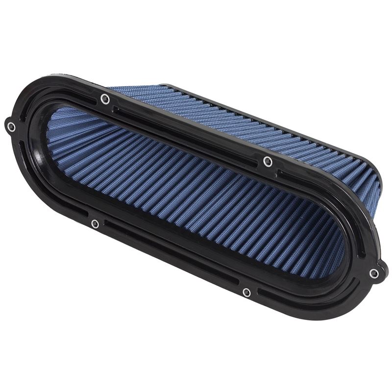 Magnum Flow Pro 5R Oval Tapered Blue Air Filter (10-10118) by aFe. Constructed with 100% polyurethane on top and bottom, this high flow, oiled OE replacement performance filter will outflow stock paper filter for improved horsepower and torque. Five layers of progressively finer mesh cotton gauze media provide maximum airflow for best performance results. Washable and reusable for multiple cleaning cycles, the tall open evenly spaced pleats provide excellent dust holding capacity for longer service cycle between cleanings. Integrated urethane bump seal insures tight, no leak seal over the life of the filter.