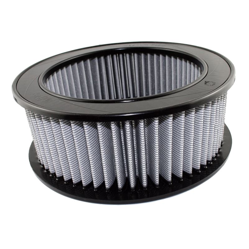Magnum Flow Pro Dry S Round Gray Air Filter (11-10064) by aFe. Constructed with 100% polyurethane on top and bottom, this high flow "oil-free" OE replacement performance filter will outflow stock paper filter for improved horsepower and torque. Three layers of progressively finer mesh synthetic media provide maximum convenience and easy maintenance. Washable and reusable for multiple cleaning cycles, the tall open evenly spaced pleats provide excellent dust holding capacity for longer service cycle between cleanings. Integrated urethane bump seal with a built in metal support ring insures a tight, no leak seal over the life of the filter.