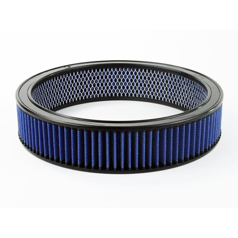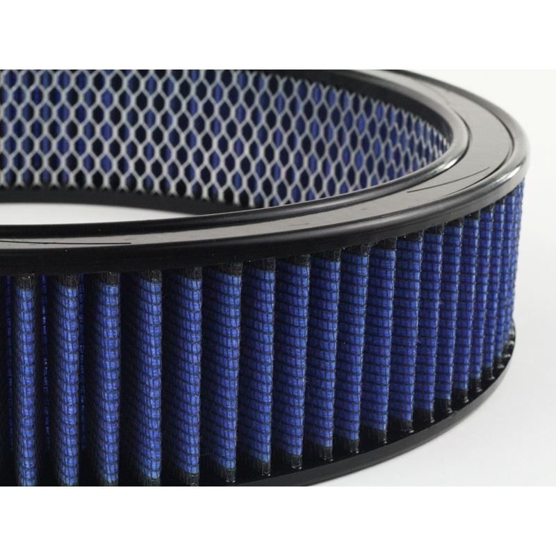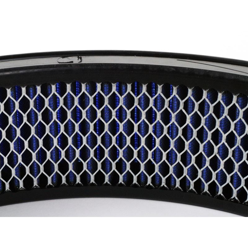 Magnum Flow Pro 5R Round Blue Air Filter with Expended Metal (10-20009) by aFe. This high flow Pro 5R air filters are constructed with 100% polyurethane on all sides and will out flow the stock paper filters for improved performance. Five layers of progressively finer cotton media provides maximum air flow. Washable and reusable for multiple cleaning cycles, the tall, open and evenly spaced filter pleats provide excellent dust holding capacity for longer service cycle between cleanings. An integrated urethane bump seal insures a tight, leak-free seal over the life of the filter. The aFe filter system increased air flow 25% over the factory air filter set increasing horsepower, torque and improving throttle response.