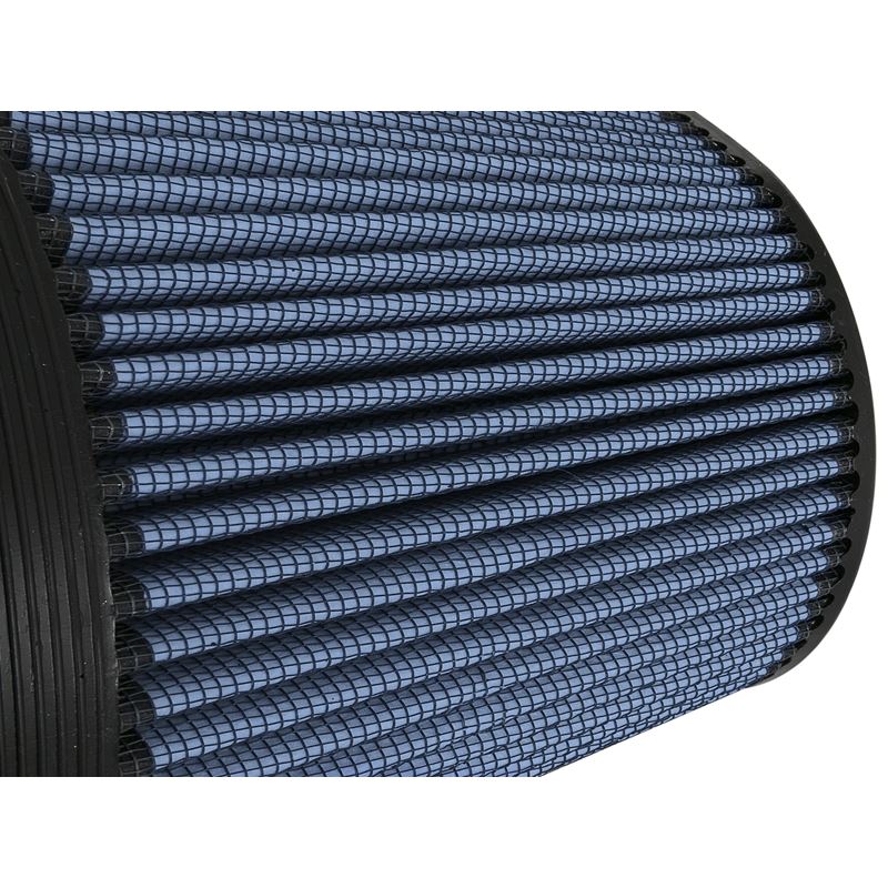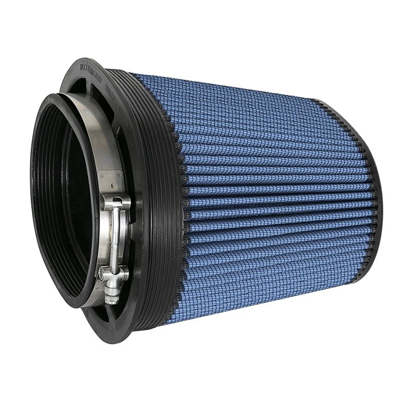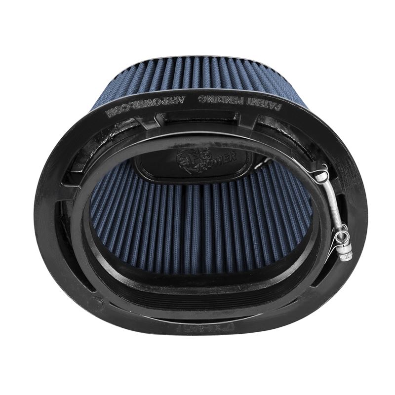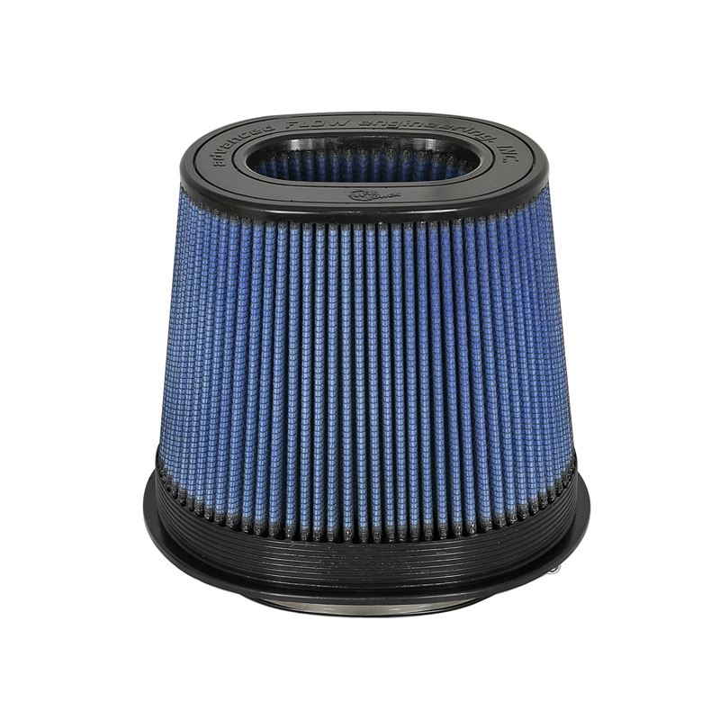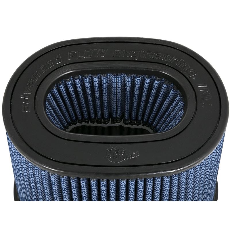 Magnum Flow Pro 5R Oval Tapered Blue Air Filter (24-91116) by aFe. This high flow Pro 5R air filters are constructed with 100% polyurethane on all sides and will out flow the stock paper filters for improved performance. Five layers of progressively finer cotton media provides maximum air flow. Washable and reusable for multiple cleaning cycles, the tall, open and evenly spaced filter pleats provide excellent dust holding capacity for longer service cycle between cleanings. An integrated urethane bump seal insures a tight, leak-free seal over the life of the filter. The aFe filter system increased air flow 25% over the factory air filter set increasing horsepower, torque and improving throttle response.