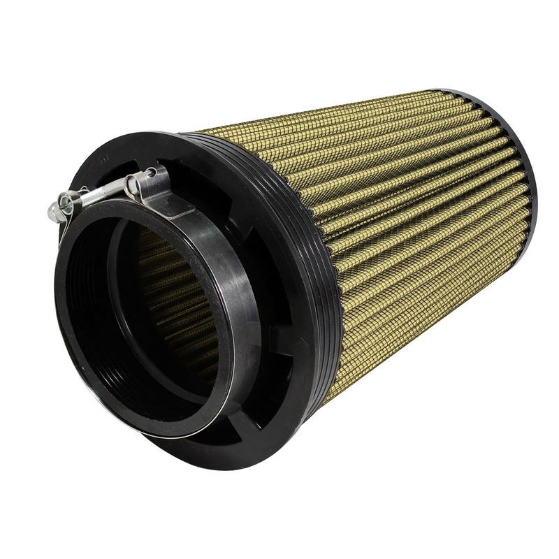 Magnum Flow Pro Guard 7 Round Tapered Tan Air Filter (72-90084) by aFe. This Pro Guard 7 performance air filter outflows the factory intake by 44%. The Inverted? design of this unique OE replacement filter fully utilized the space in the stock air box to provide the most filter media of any drop-in? OE replacement filter. With seven layers of progressively finer mesh cotton gauze/synthetic media, this high flow oiled? OE replacement performance filter provide maximum protection with highest cumulative filtration efficiency for severe duty environments. Washable and reusable for multiple cleanings, the tall open evenly spaced pleats provide excellent dust holding capacity for longer service cycle between cleanings. Integrated urethane bump seal insures tight, no leak seal over the life of the filter.