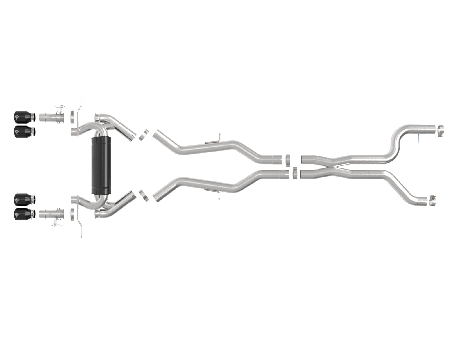 This cat-back exhaust system is constructed of 3 IN - 2-1/2 IN mandrel-bent brushed finished 304 stainless steel tubing for maximum strength and durability. This system features a high-flow stainless steel high-temperature metallic black muffler, producing a powerful sound. The muffler has a high-temperature metallic black finish for ultimate corrosion resistance. Finishing off this exhaust system are quad 4 IN diameter black stainless steel clamp-on exhaust tips. The tips features a laser etched aFe POWER logo for a unique style. This system produces a powerful sound unleashing all available horsepower and torque. Some cutting may be required, see instruction sheet for further information. Utilizing factory style hangers this system mounts directly to factory mounting locations for a hassle-free installation. A mitered merge x-pipe is used to balance and evenly distribute exhaust pulses traveling through the exhaust system, minimizing exhaust drone and maximizing scavenging. This system incorporates factory style exhaust valves which use the factory exhaust valve motors (not included). The valves help regulate, direct and control the flow of exhaust gases by opening, closing, or partially obstructing passageways depending on throttle position for maximum performance. State-of-the-art computer-aided design technology is utilized for precise vehicle fitment. 100% TIG-Welded for race-proven strength and durability.