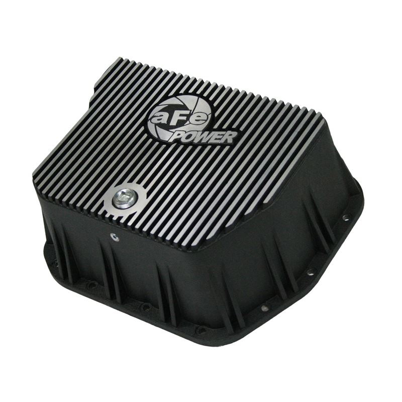 Transmission Pan (46-70052) by aFe. Quantity: 1 Piece. Finish: Black. Upgrade your transmission with this finned aluminum pan and increase fluid capacity, improve fluid cooling and ease future maintenance jobs. It includes a magnetic drain plug, temperature sensor port, and internal and external cooling fins. Transmission pan comes complete with all necessary hardware to bolt directly to factory location for a hassle-free installation. Compatible with stock filter and able to reuse stock factory gasket.