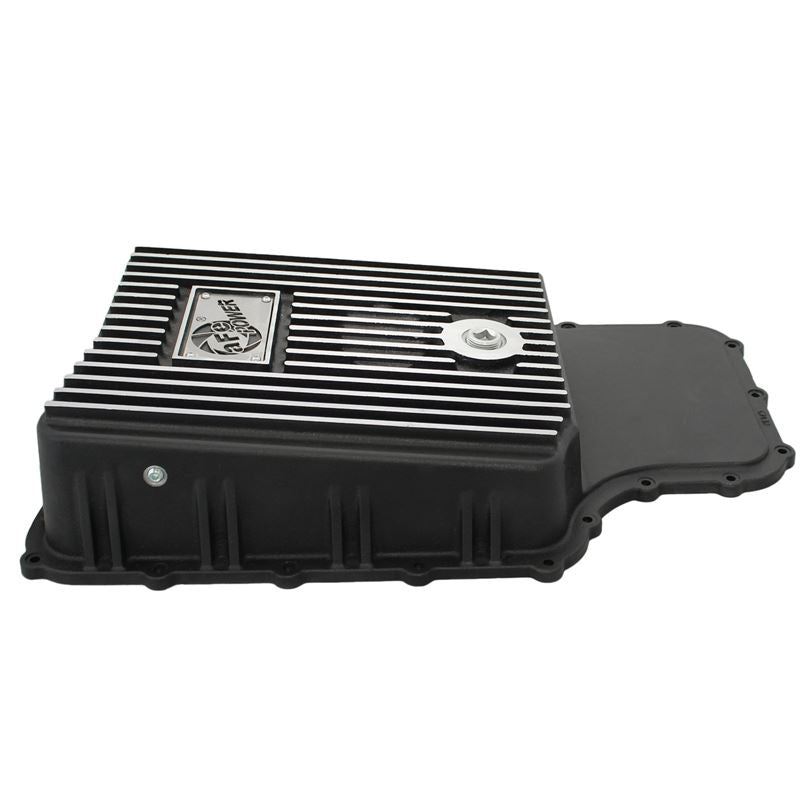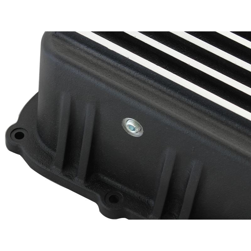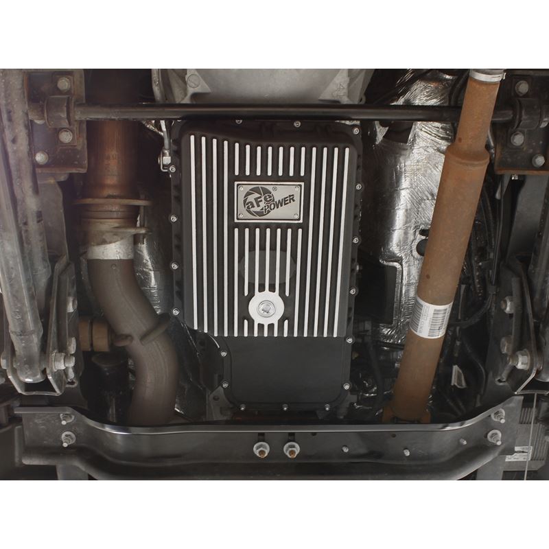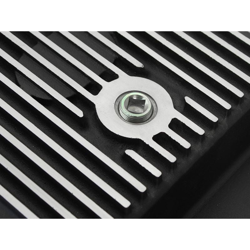 Transmission Pan (46-70182) by aFe. Quantity: 1 Piece. Finish: Black. Upgrade your transmission with this finned aluminum pan and increase fluid capacity, improve fluid cooling and ease future maintenance jobs. It includes a magnetic drain plug, temperature sensor port, and internal and external cooling fins. Transmission pan comes complete with all necessary hardware to bolt directly to factory location for a hassle-free installation. Compatible with stock filter and able to reuse stock factory gasket.