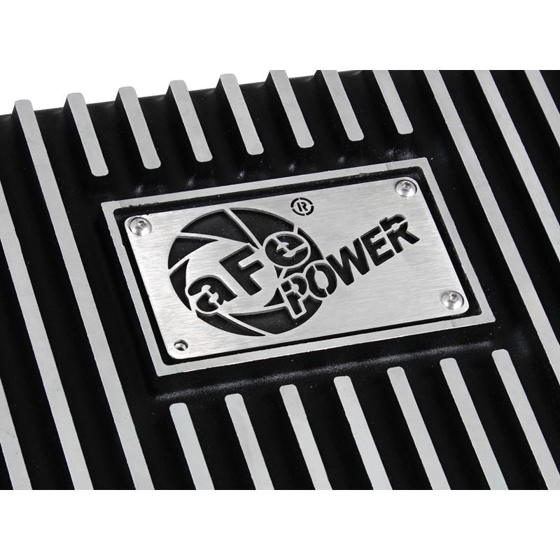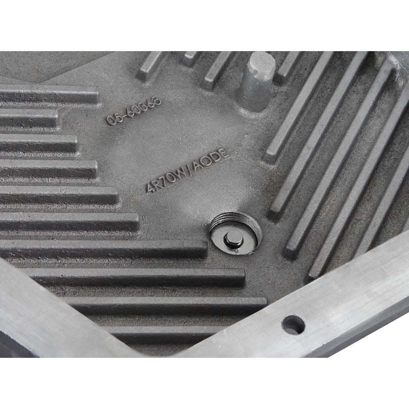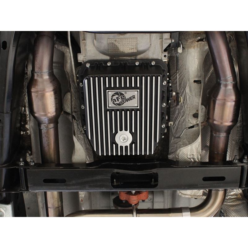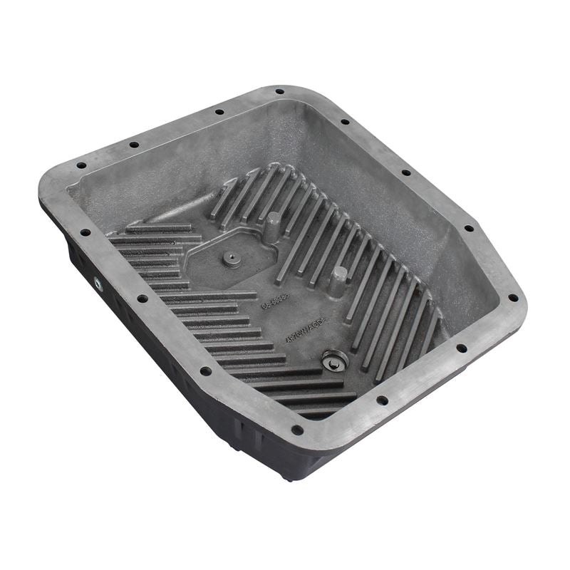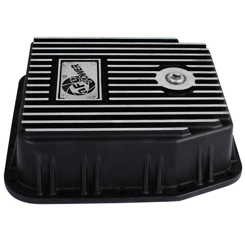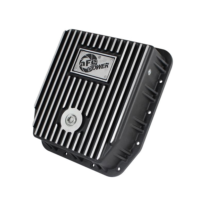 Transmission Pan (46-70222) by aFe. Quantity: 1 Piece. Finish: Black. Upgrade your transmission with this finned aluminum pan and increase fluid capacity, improve fluid cooling and ease future maintenance jobs. It includes a magnetic drain plug, temperature sensor port, and internal and external cooling fins. Transmission pan comes complete with all necessary hardware to bolt directly to factory location for a hassle-free installation. Compatible with stock filter and able to reuse stock factory gasket.