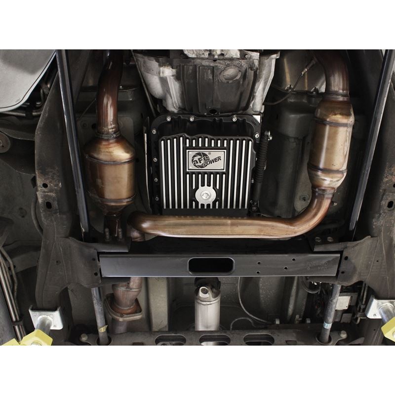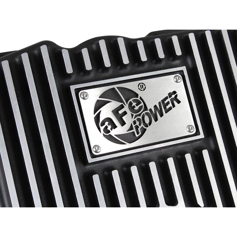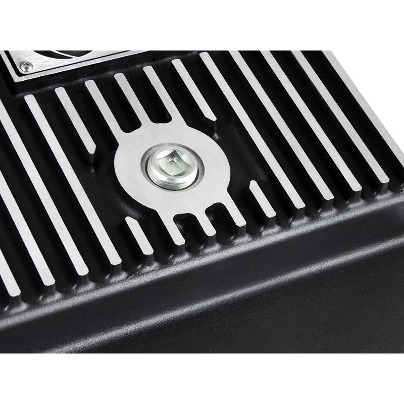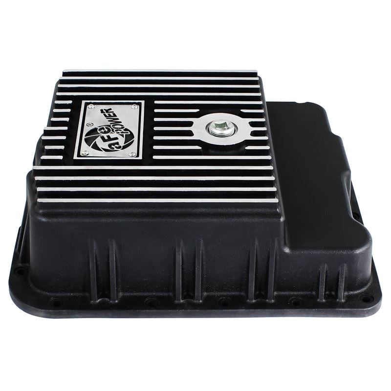 Transmission Pan (46-70242) by aFe. Quantity: 1 Piece. Finish: Black. Upgrade your transmission with this finned aluminum pan and increase fluid capacity, improve fluid cooling and ease future maintenance jobs. It includes a magnetic drain plug, temperature sensor port, and internal and external cooling fins. Transmission pan comes complete with all necessary hardware to bolt directly to factory location for a hassle-free installation. Compatible with stock filter and able to reuse stock factory gasket.