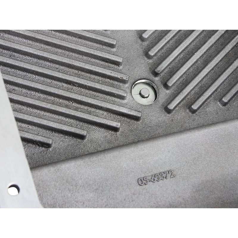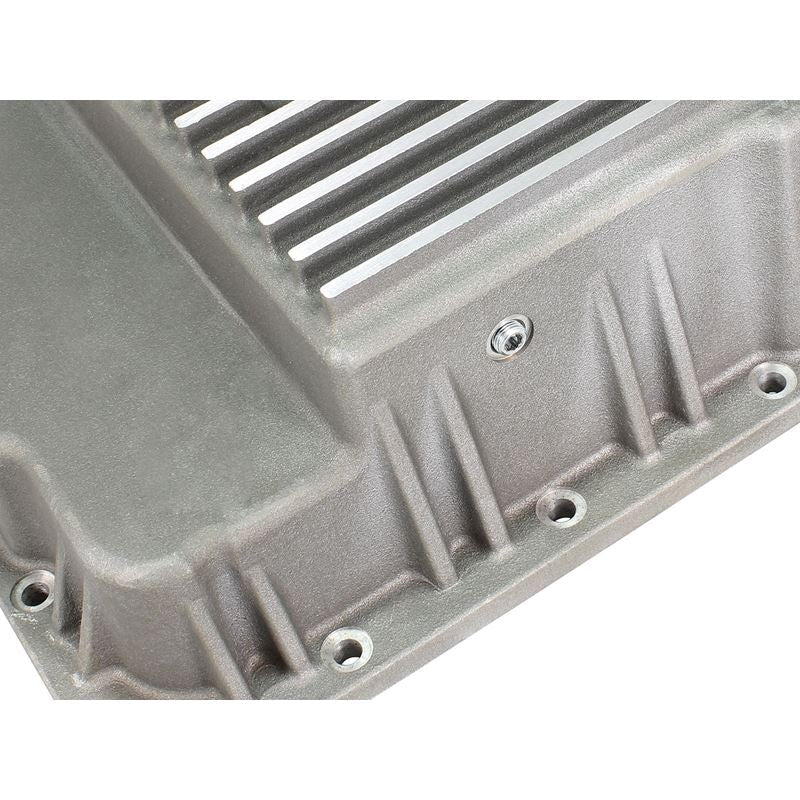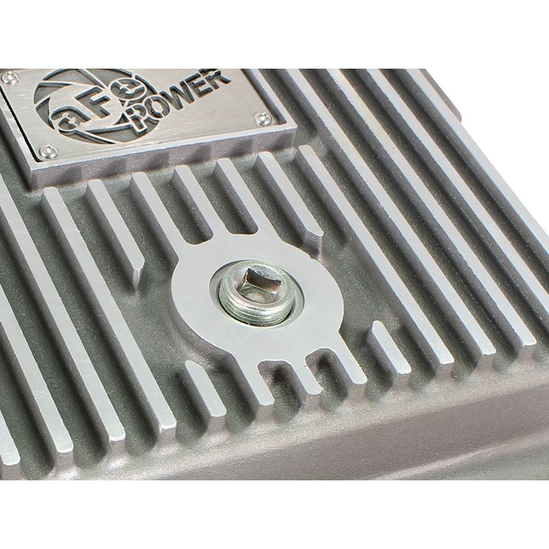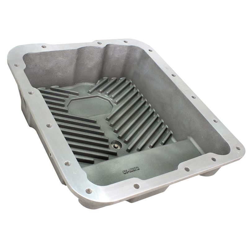 Transmission Pan (46-70240) by aFe. Quantity: 1 Piece. Finish: Raw. Upgrade your transmission with this finned aluminum pan and increase fluid capacity, improve fluid cooling and ease future maintenance jobs. It includes a magnetic drain plug, temperature sensor port, and internal and external cooling fins. Transmission pan comes complete with all necessary hardware to bolt directly to factory location for a hassle-free installation. Compatible with stock filter and able to reuse stock factory gasket.