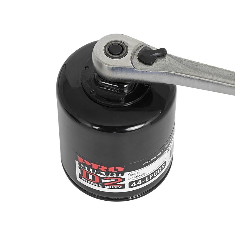 And even though the Pro Guard D2 Oil Filter is designed for long service life, aFe didn't forget about filter removal. To make sure you don't have to wrestle with a stuck filter, aFe welded a 1" outside, 3/8" inside nut/ratchet drive fitting to the top of the filter canister. This way the filter can be easily removed with a socket or ratchet.