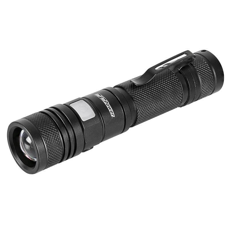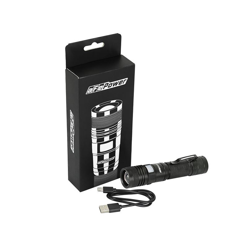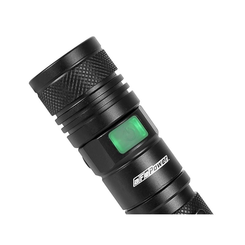 Put some powerful light on your subject with aFe POWER's super bright CREE LED 950 lumen flashlight. This compact flashlight features a water and shock proof, anti-slip textured aluminum body and adjustable permeable optical glass to increase brightness. Perfect for wrenching in the garage and outdoor use, the aFe Power LED flashlight is rechargeable through a built-in Micro USB port and features 5 light modes: high, middle, low, strobe and SOS. Fully zoomable from wide to narrow beam and can run up to 2 hours per charge on high mode.