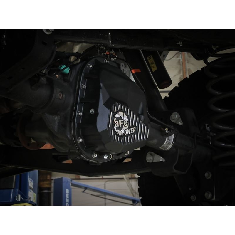 aFe POWER's rear differential cover brings performance engineering to the protection of your truck's rear-end. This differential cover is constructed out of durable die-cast aluminum with reinforced ribs for maximum strength. The Pro Series differential covers include an oil level sight glass and deep reach magnetic dip stick for maximum protection. This cover fits the Ford 9.75 rear axle and is compatible on vehicles equipped with a factory rear track bar. Built-in external fins transfer heat from the fluid to the outside air for maximum cooling. This system incorporates a large magnetic drain and deep reach fill plug to capture loose particles for maximum rear-end protection. Large oil level sight glass with calibration plug set to the factory fluid level to eliminate overfilling.