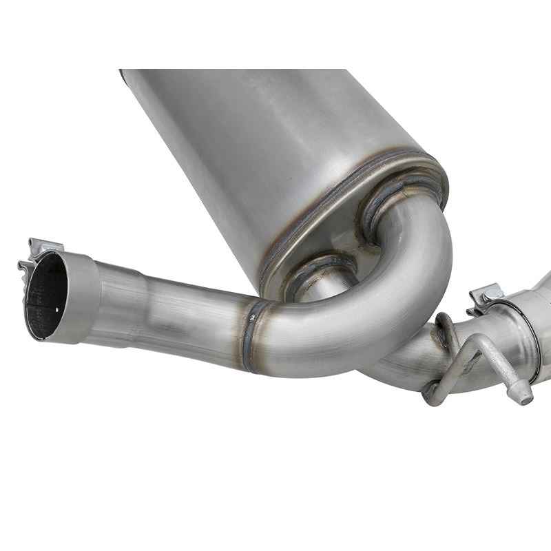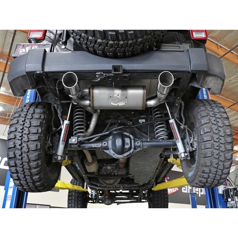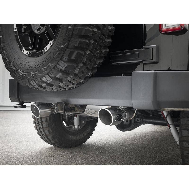 Rebel Series 409 SS Axle-Back Exhaust System with Split Rear Exit (49-48061-P) by aFe. Exhaust System Type: Axle-Back. Exhaust Tubing Material: 409 SS. Main Tubing Diameter: 2.5". Exhaust System Sound: Aggressive / Loud. aFe power introduces an all new Rebel Series exhaust system. This Rebel Series cat-back is designed with dual intercooled exhaust tips that exit in front of the rear passenger tire for a unique, aggressive look.