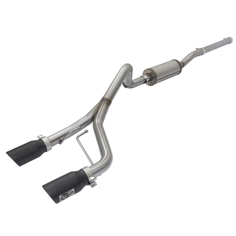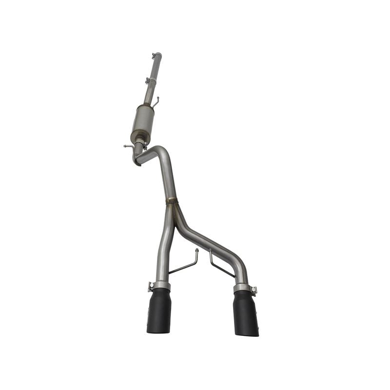 Rebel Series 409 SS Cat-Back Exhaust System with Split Rear Exit (49-48056-B) by aFe. Exhaust System Type: Cat-Back. Exhaust Tubing Material: 409 SS. Main Tubing Diameter: 2.5". Exhaust System Sound: Moderate. aFe power introduces an all new Rebel Series exhaust system. This Rebel Series cat-back is designed with dual intercooled exhaust tips that exit in front of the rear passenger tire for a unique, aggressive look.