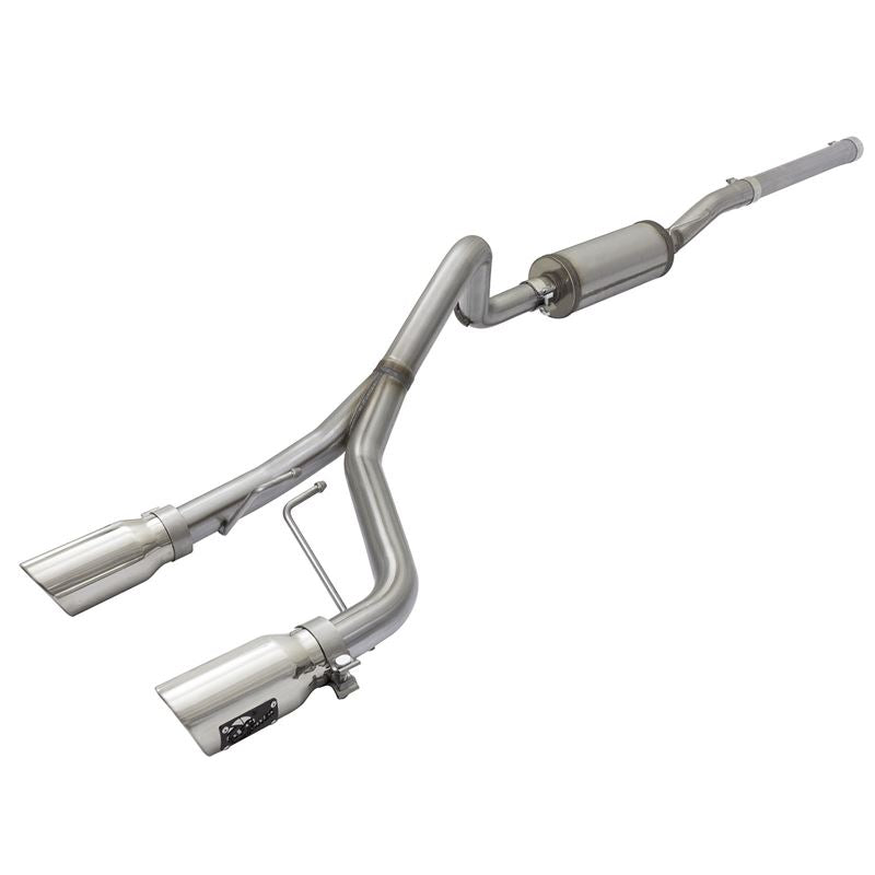 Rebel Series 409 SS Cat-Back Exhaust System with Split Rear Exit (49-48056-P) by aFe. Exhaust System Type: Cat-Back. Exhaust Tubing Material: 409 SS. Main Tubing Diameter: 2.5". Exhaust System Sound: Moderate. aFe power introduces an all new Rebel Series exhaust system. This Rebel Series cat-back is designed with dual intercooled exhaust tips that exit in front of the rear passenger tire for a unique, aggressive look.