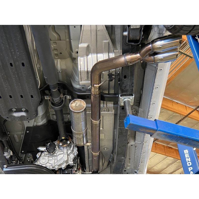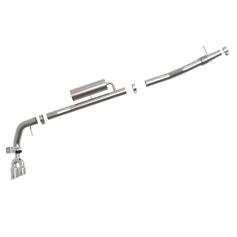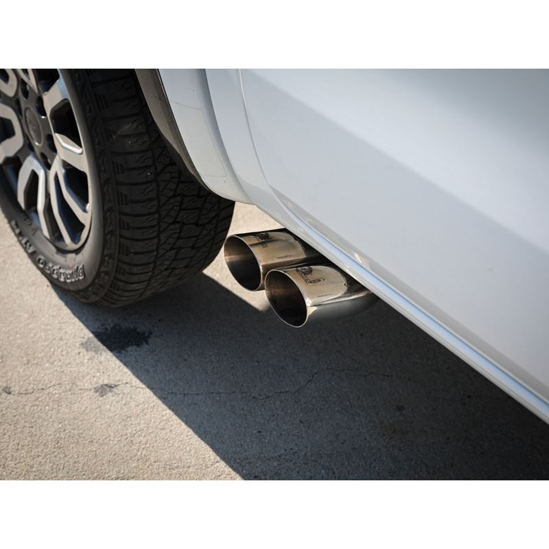 This cat-back exhaust system is constructed of 3 IN mandrel-bent 304 stainless steel tubing for maximum strength and durability. Finishing off the exhaust are dual 3-1/2 IN Polished stainless steel tips. The tips are designed to exit from in front of the rear passenger side tire for a unique custom look. This system features an integrated Tuned Helmholtz resonator to tone down any drone. Utilizing factory style hangers this system is a direct bolt-on system, which requires no cutting or modifications for a hassle-free installation. This cat-back exhaust system uses a heavy duty flex pipe with an internal interlock liner for added strength and durability. Utilizing state-of-the-art computer-aided design technology, this exhaust system is designed for custom, high tolerance factory fitment. 100% MIG-Welded for race-proven strength and durability.