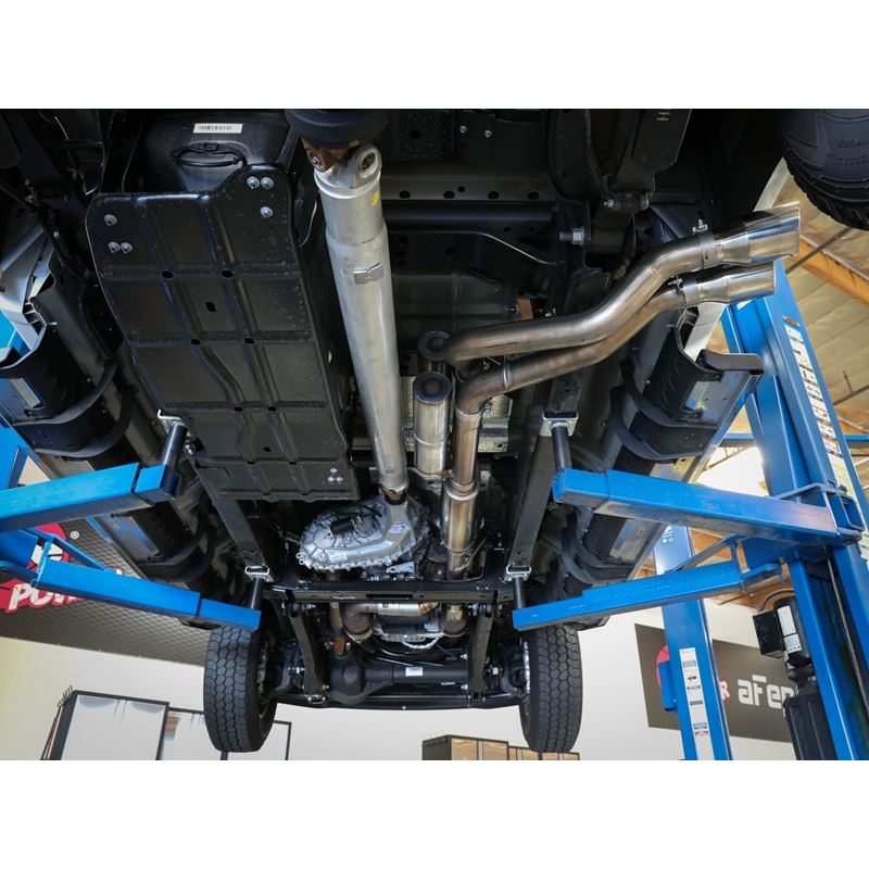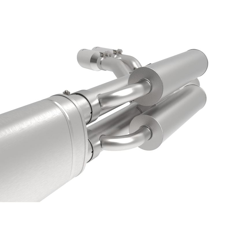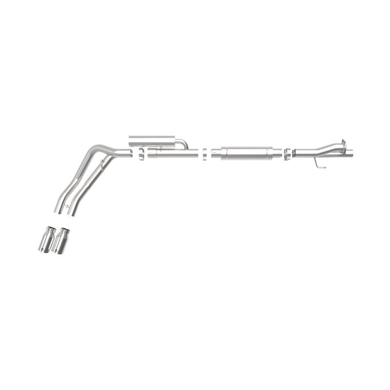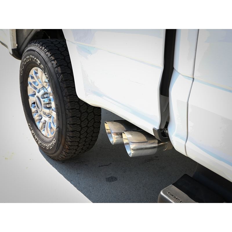 This cat-back exhaust system is constructed of 3" mandrel-bent 409 stainless steel tubing for maximum strength and durability. This system features a high-flow 409 stainless steel muffler and a tuned helmholtz resonator, producing an aggressive sound. Finishing off this exhaust system are dual 4-1/2" diameter polished 304 stainless steel clamp-on exhaust tips. The tips features a laser etched aFe POWER logo for a unique style. This system produces an aggressive sound unleashing all available horsepower and torque. Utilizing a factory style flange and hangers this system is a direct bolt-on system, which requires no cutting or modifications for a hassle-free installation. Utilizing state-of-the-art computer-aided design technology, this exhaust system is designed for custom, high tolerance factory fitment. 100% MIG-Welded for race-proven strength and durability. Crew Cab / Short Bed - 160" Wheelbase