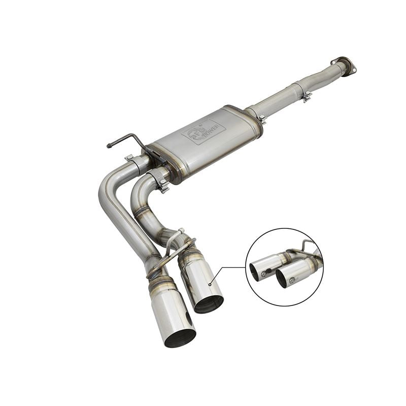 Rebel Series 409 SS Cat-Back Exhaust System with Dual Side Exit (49-46033-P) by aFe. Gains up to + 9 horsepower and + 16 lbs. x ft. of torque. Exhaust System Type: Cat-Back. Exhaust Tubing Material: 409 SS. Main Tubing Diameter: 3". Exhaust System Sound: Aggressive / Loud. aFe power introduces an all new Rebel Series exhaust system. This Rebel Series cat-back is designed with dual intercooled exhaust tips that exit in front of the rear passenger tire for a unique, aggressive look.
