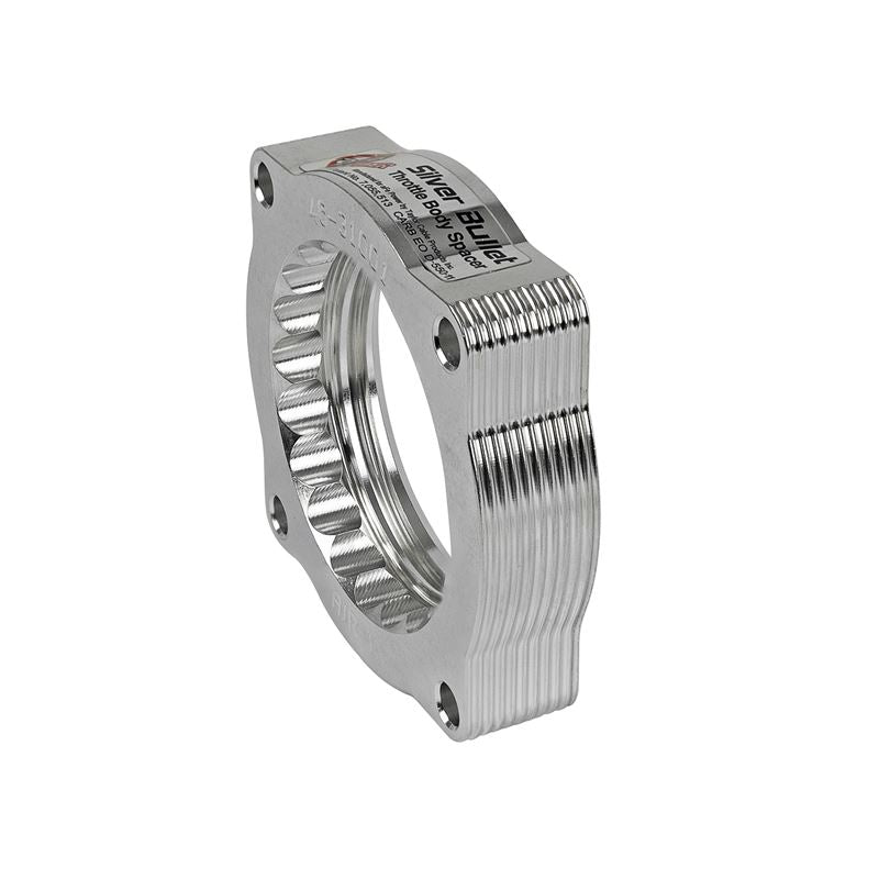 Silver Bullet Throttle Body Spacer by aFe. What is inexpensive, takes only a few minutes to install, and results in more power and improved throttle response? The aFe Silver Bullet! The Silver Bullet Throttle Body Spacer installs between your throttle body and intake manifold. It creates turbulence and improves volumetric efficiency for more complete combustion.