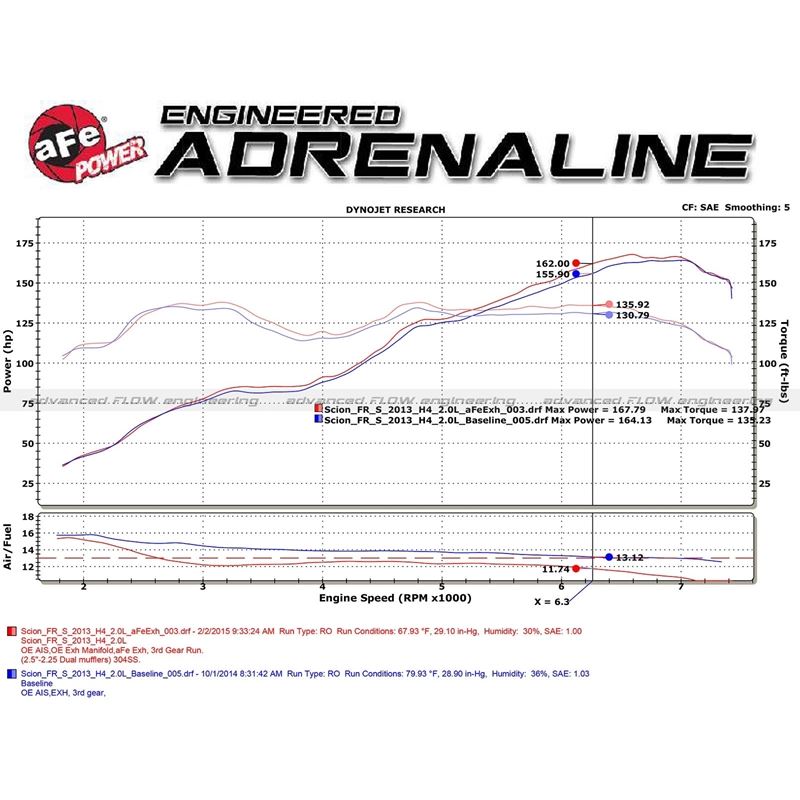 aFe is proud to introduce the Takeda Dual Cat-Back Exhaust System. This exhaust system in testing, produced a max gain of +5 horsepower and +6 ft. lbs. of torque verified by our in house dyno. The exhaust system is constructed from 2-1/2" mandrel bent 304 stainless steel and is 100% TIG-welded. This system was designed and engineered by tuning the perfect tube lengths, ultimately maximizing performance across the power band while maintaining a great tone. To finish off this exhaust are two 4.75" oval double wall black stainless steel tips. This exhaust design uses all factory hanger locations for a hassle free installation. No modifications necessary.