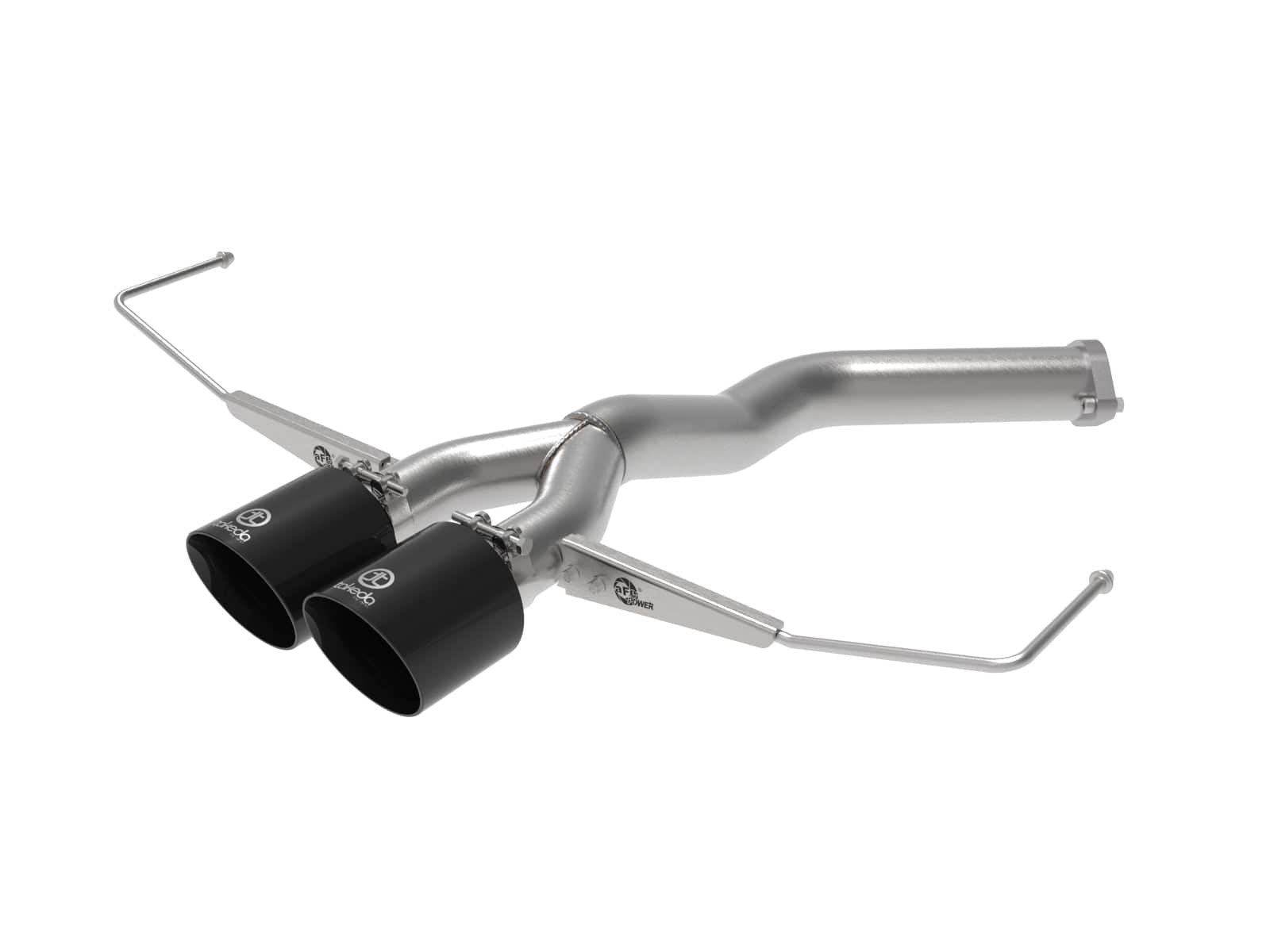 Performance Gains: This system produced gains of up to +8 HP and +8 lbs. x Ft. TQ., as measured on our in-house dyno. 3" - 2-1/2" 304 Stainless Steel Construction: This axle-back exhaust system is constructed of 3" - 2-1/2" mandrel-bent 304 stainless steel tubing for maximum strength and durability. Dual 4-1/2" Diameter Black Exhaust Tips: Finishing off this exhaust system are dual 4-1/2" diameter black 304 stainless steel clamp-on exhaust tips. The tips feature a laser etched Takeda logo for a unique style. Throaty Sound: This system produces a throaty sound unleashing all available horsepower and torque. Installation: Utilizing a factory style flange and hangers this system is a direct bolt-on system, which requires no cutting or modifications for a hassle-free installation. Integrated Mitered Merge Collector: A mitered merge collector is used to decrease turbulence and increase exhaust velocity resulting in increased horsepower, torque and improved throttle response. Computer-Aided Design: Utilizing state-of-the-art computer-aided design technology, this exhaust system is designed for custom, high tolerance factory fitment. MIG-Welded: 100% MIG-Welded for race-proven strength and durability. Emissions Disclaimer: This product does not require a CARB EO#. aFe POWER exhaust systems are engineered and manufactured in our Corona, California facility.