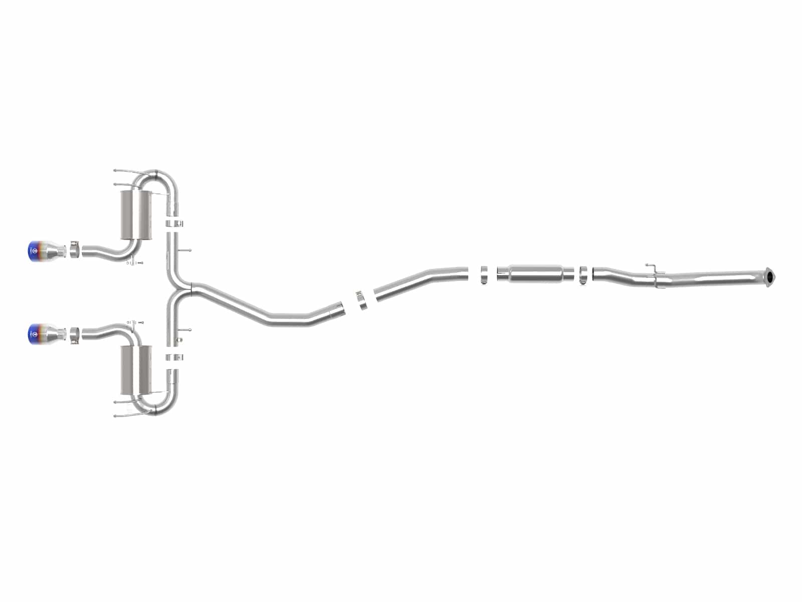 Performance Gains: This system produced gains of up to +6 HP and +5 lbs. x Ft. TQ., as measured on our in-house dyno. 3" - 2-1/2" 304 Stainless Steel Construction: This cat-back exhaust system is constructed of 3" - 2-1/2" mandrel-bent, brushed finished 304 stainless steel tubing for maximum strength and durability. High-Flow 304 Stainless Steel Polished Mufflers: This system features high-flow 304 stainless steel polished mufflers, producing a smooth sound. The mufflers has a polished finish for ultimate corrosion resistance. Dual 4-1/2" Diameter Blue Flame Exhaust Tips: Finishing off this exhaust system are dual 4-1/2" diameter blue flame 304 stainless steel clamp-on exhaust tips. The tips features a laser etched Takeda logo for a unique style. Installation: Utilizing a factory style flange and hangers this system is a direct bolt-on system, which requires no cutting or modifications for a hassle-free installation. Integrated Mitered Merge Collector: A mitered merge collector is used to decrease turbulence and increase exhaust velocity resulting in increased horsepower, torque and improved throttle response. Computer-Aided Design: Utilizing state-of-the-art computer-aided design technology, this exhaust system is designed for custom, high tolerance factory fitment. TIG-Welded: 100% TIG-Welded for race-proven strength and durability. Emissions Disclaimer: This product does not require a CARB EO#. aFe POWER exhaust systems are engineered and manufactured in our Corona, California facility.