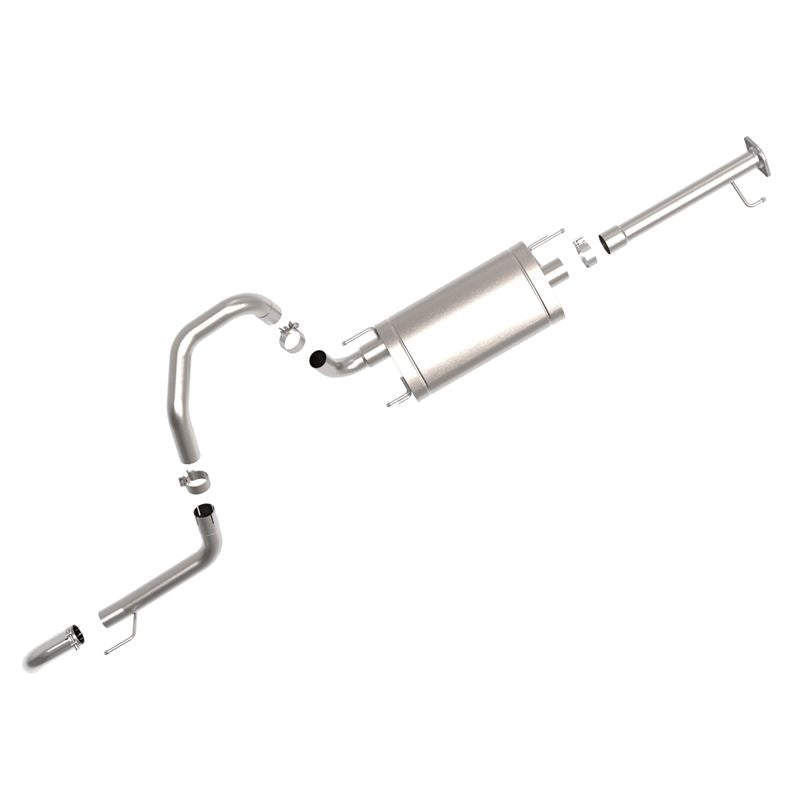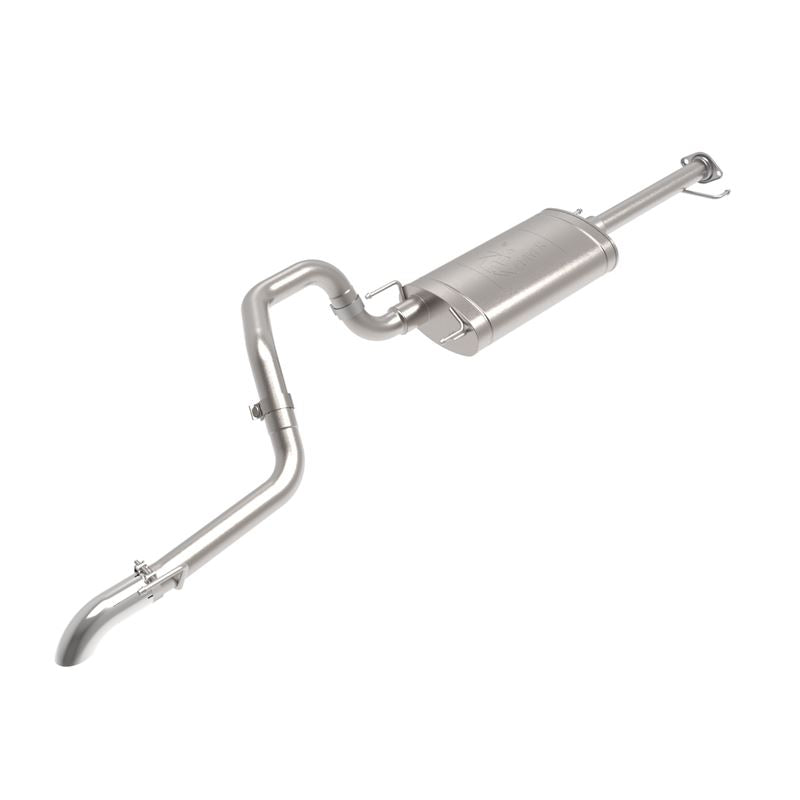 This cat-back exhaust system is constructed of 2-1/2 IN mandrel-bent 304 stainless steel tubing for maximum strength and durability. This system features a high-flow 304 stainless steel muffler, producing a aggressive sound. Muffler finish may vary. Finishing off this exhaust system is a 2-1/2 IN diameter 304 stainless steel clamp-on, turn down tip. The tip features a laser etched aFe POWER logo for a unique style. This system produces an aggressive sound unleashing all available horsepower and torque. Utilizing a factory style flange and hangers this system is a direct bolt-on system, which requires no cutting or modifications for a hassle-free installation. This cat-back exhaust system is finished off with a hi-tuck tip that is developed to give you extra clearance during extreme angle climbs or descents protecting exhaust over rough terrain. Utilizing state-of-the-art computer-aided design technology, this exhaust system is designed for custom, high tolerance factory fitment. 100% MIG-Welded for race-proven strength and durability.