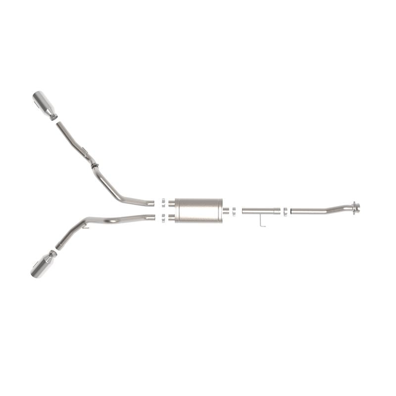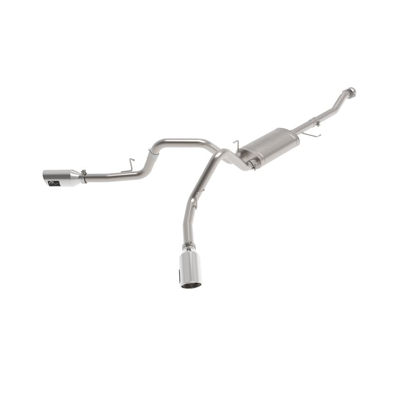 This cat-back exhaust system is constructed of 3 IN mandrel-bent 304 stainless steel tubing for maximum strength and durability. This system features a high-flow 409 stainless steel muffler, producing a aggressive sound. Finishing off this exhaust system are dual 4-1/2 IN diameter polished 304 stainless steel clamp-on exhaust tips. The tips features an aFe POWER logo plate riveted on for a unique style. This system produces an aggressive sound unleashing all available horsepower and torque. Utilizing a factory style flange and hangers this system is a direct bolt-on system, which requires no cutting or modifications for a hassle-free installation. Utilizing state-of-the-art computer-aided design technology, this exhaust system is designed for custom, high tolerance factory fitment. 100% MIG-Welded for race-proven strength and durability.